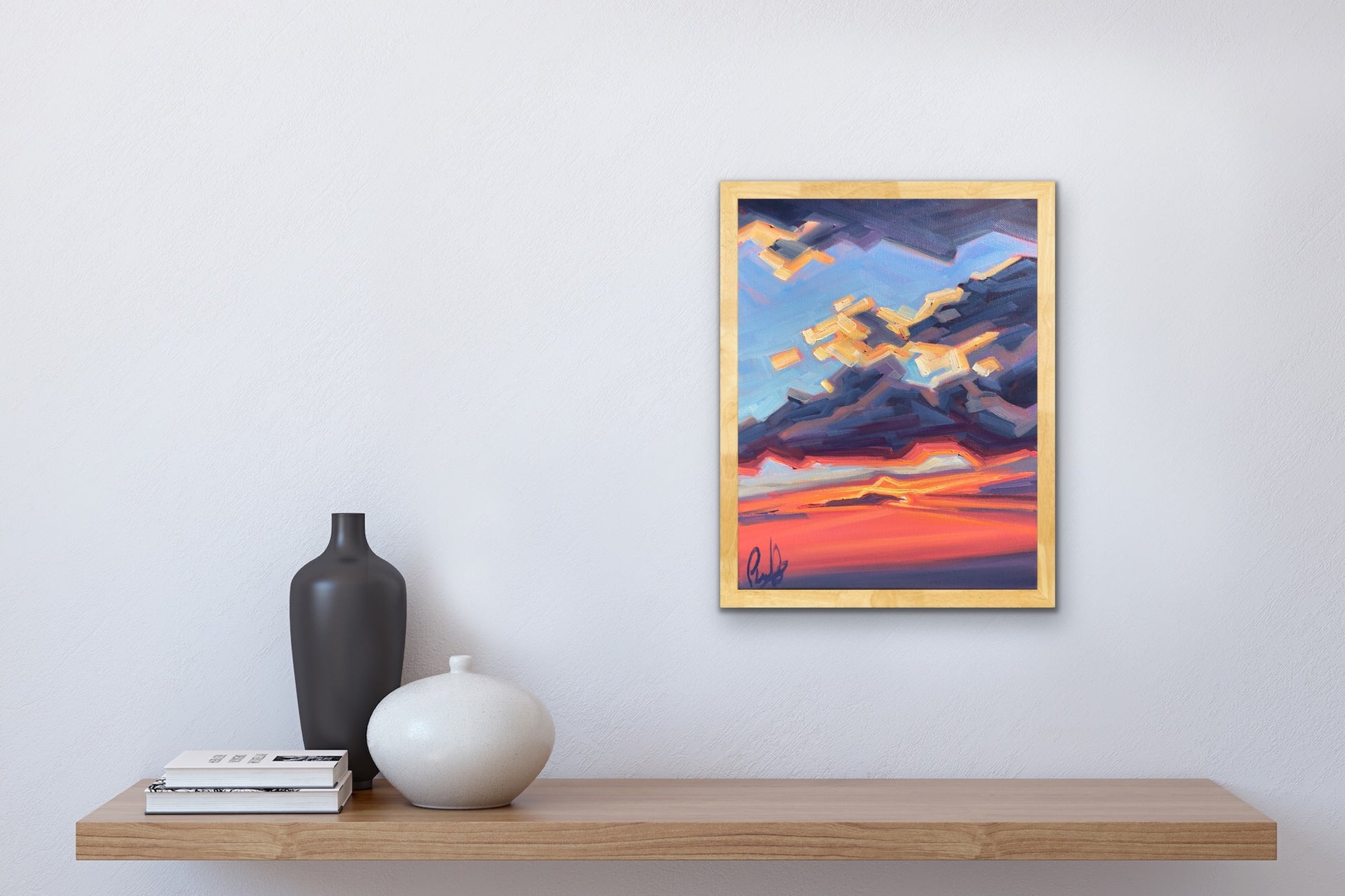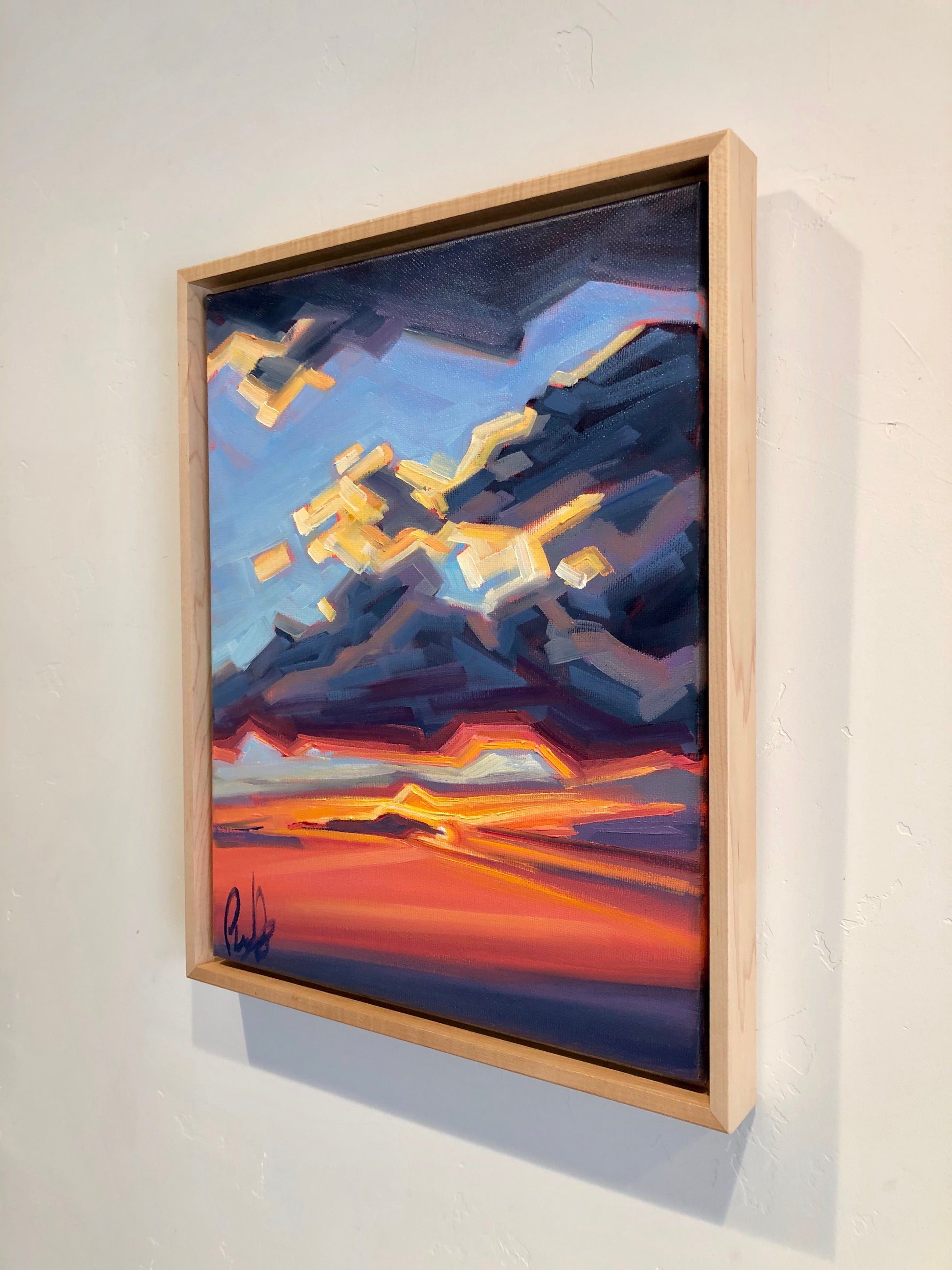 Second, I am constantly investigating new ways to represent clouds in my art. Just as clouds are always shifting and changing in the sky, my stylistic approach to representing and communicating their essence is always evolving and unfolding. Recently, I have been working to break apart their soft billowy, featherlike qualities and instead render their various layers and qualities as rectangular strokes of value and color. I am striving to give the impression of the layers and, perhaps even more importantly, the feeling that the strokes of paint create. By using individual marks, as just the suggestion of clouds, there is a looseness and a freedom that allows us to feel their impermanence.