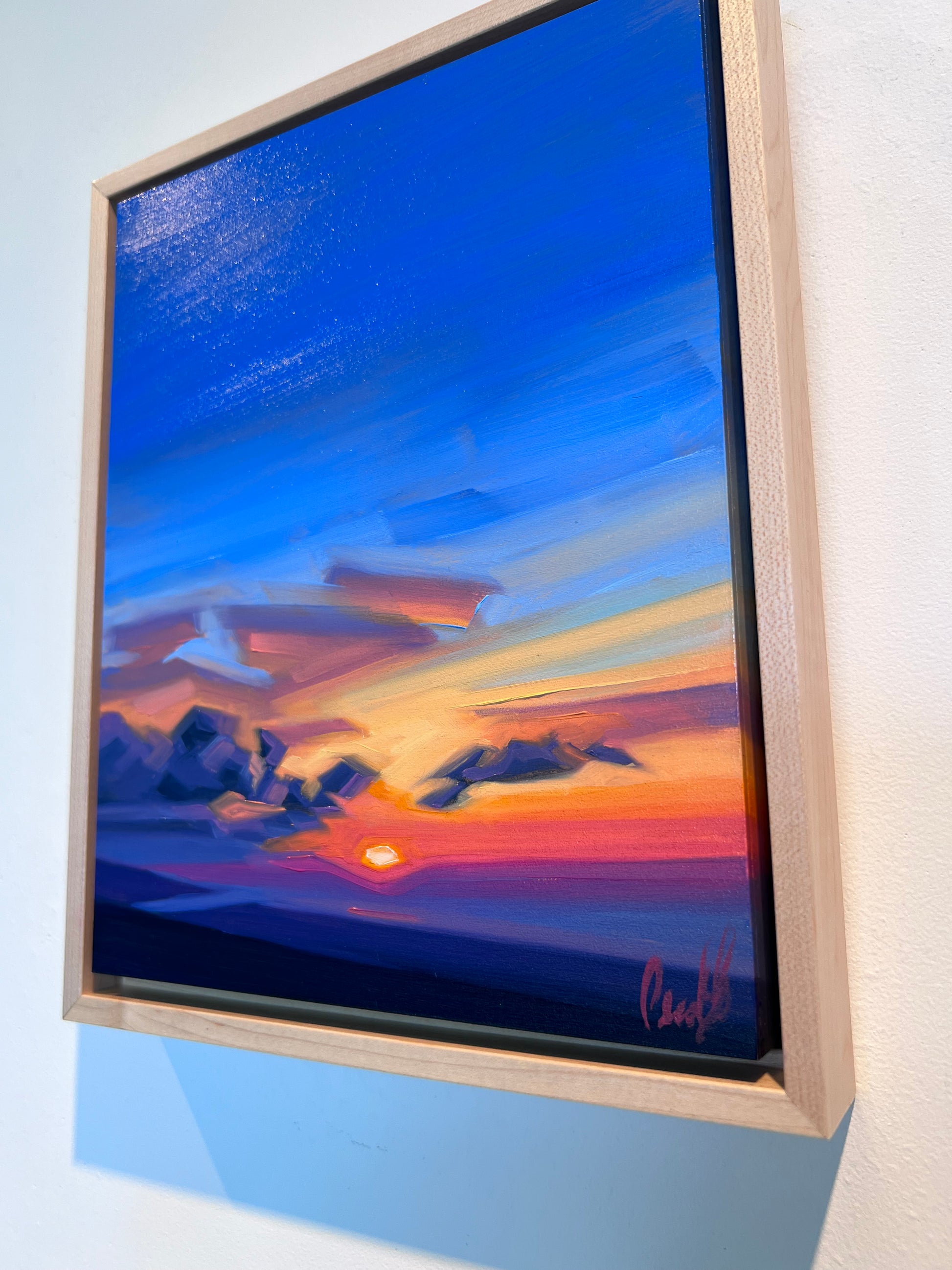 I started this Mini Abstract Sunset series out of the necessity to allow spontaneity to come through the process of painting. Deliberate, simple, vibrant, soothing blocks of moving color penetrate the scene. Working on smaller canvas allows me to be in the moment and to further develop this experimental style, allowing the spontaneous gesture of brushstrokes and how they relate with one another in the composition. Like the fleeting passing of a sunset, the aim is to think less and be in the moment as that moment passes.