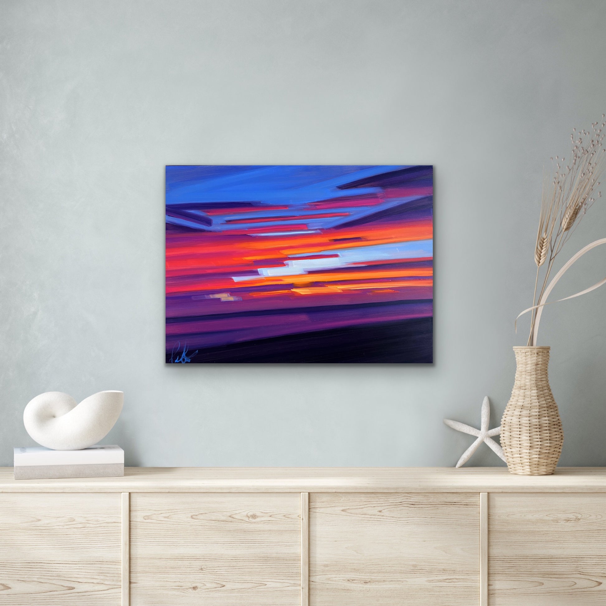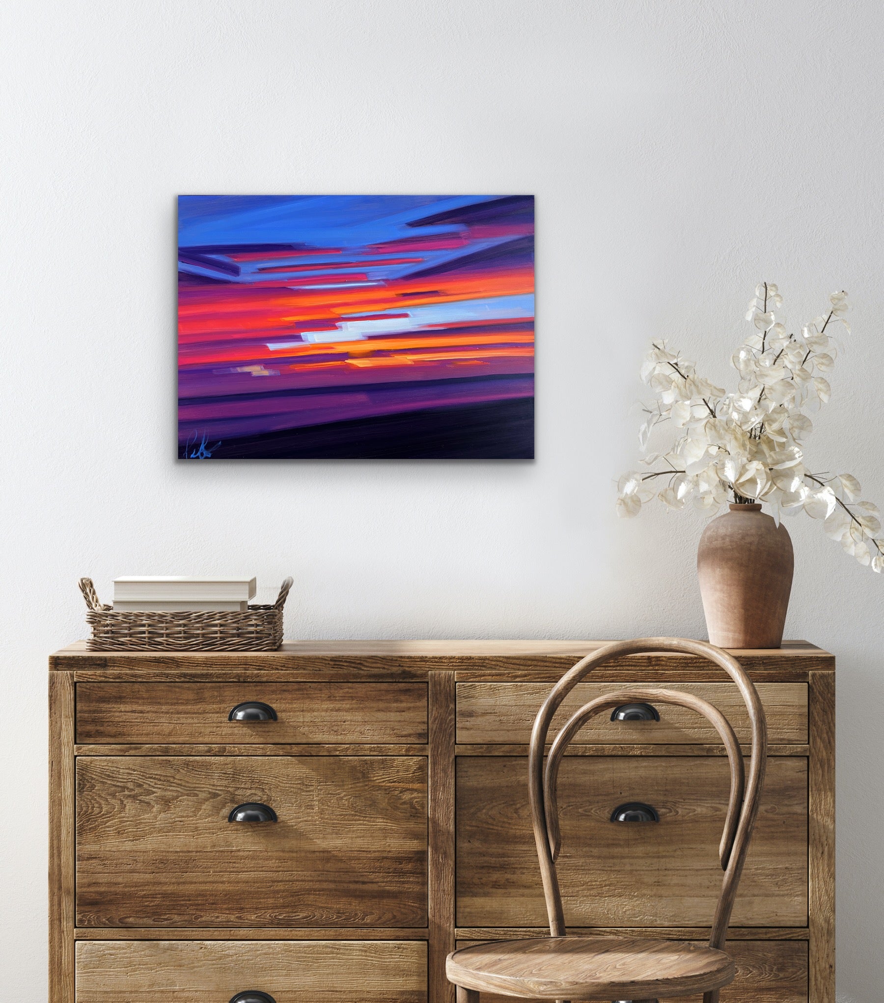 This small original, painted in the style that I am currently experimenting with, which focuses on abstracting the landscape. The sun sets behind the clouds in the distance, illuminating underneath them with vibrant pinks, soothing purples, and luminous golden yellows. I love the angular brushstrokes and how they glide across the canvas as I’m painting it. Smooth, fluid and filled with glistening butter like oil paint. Am I weird if I want to lick it?