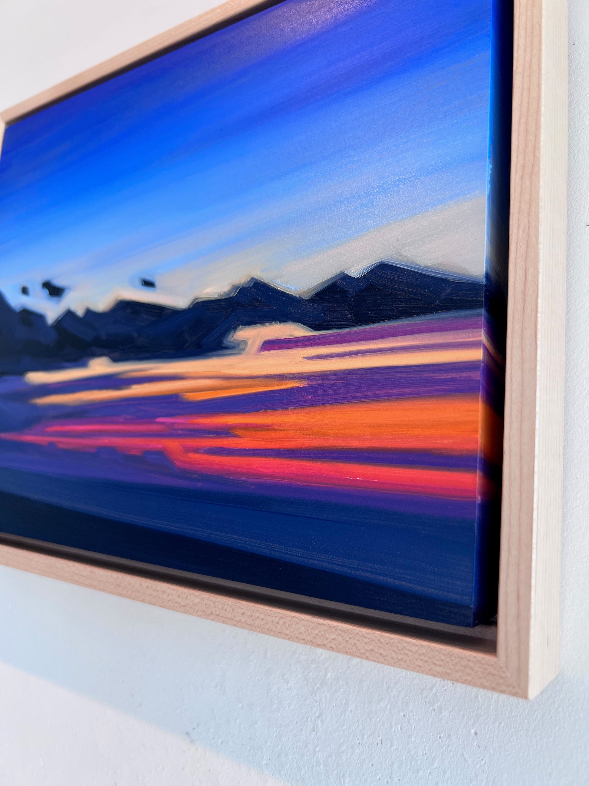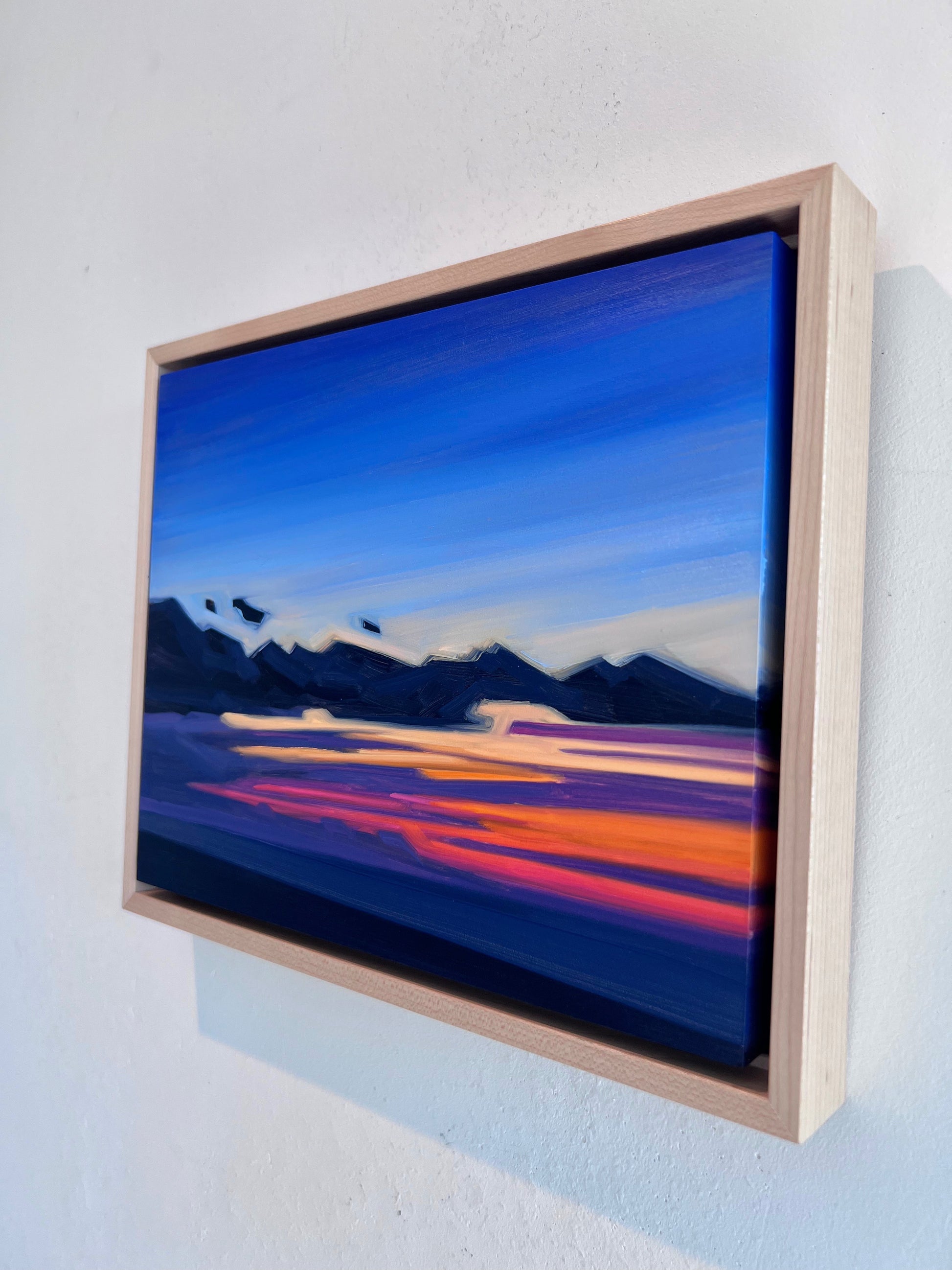 I started this Mini Abstract Sunset series out of the necessity to allow spontaneity to come through the process of painting. Deliberate, simple, vibrant, soothing blocks of moving color penetrate the scene. Working on smaller canvas allows me to be in the moment and to further develop this experimental style, allowing the spontaneous gesture of brushstrokes and how they relate with one another in the composition. Like the fleeting passing of a sunset, the aim is to think less and be in the moment as that moment passes.