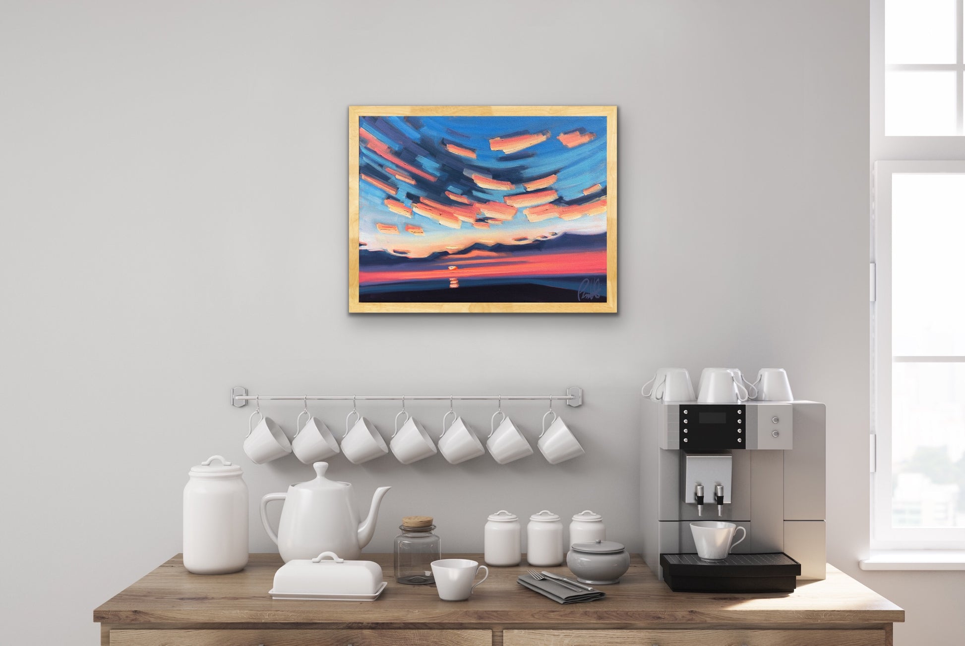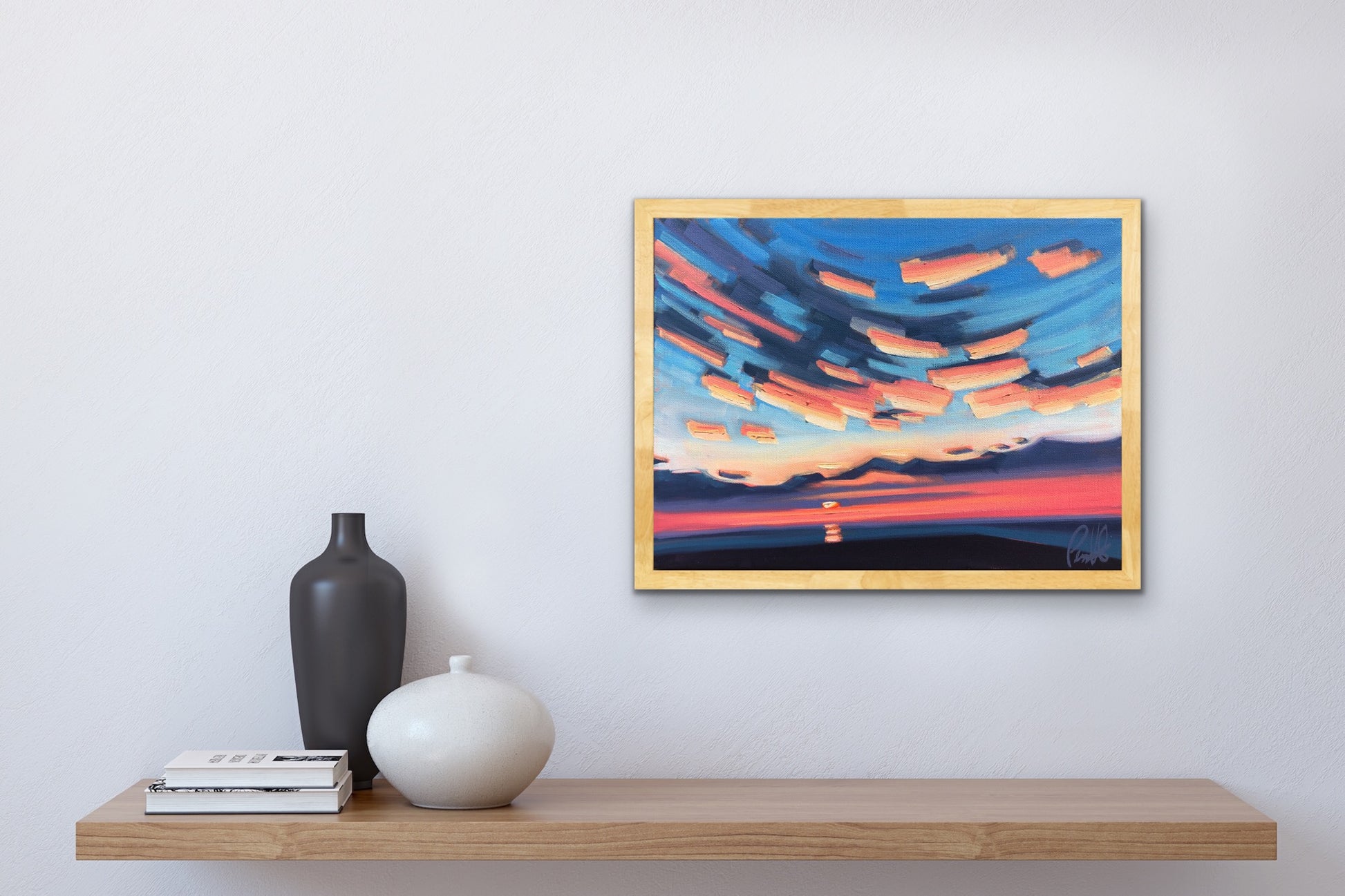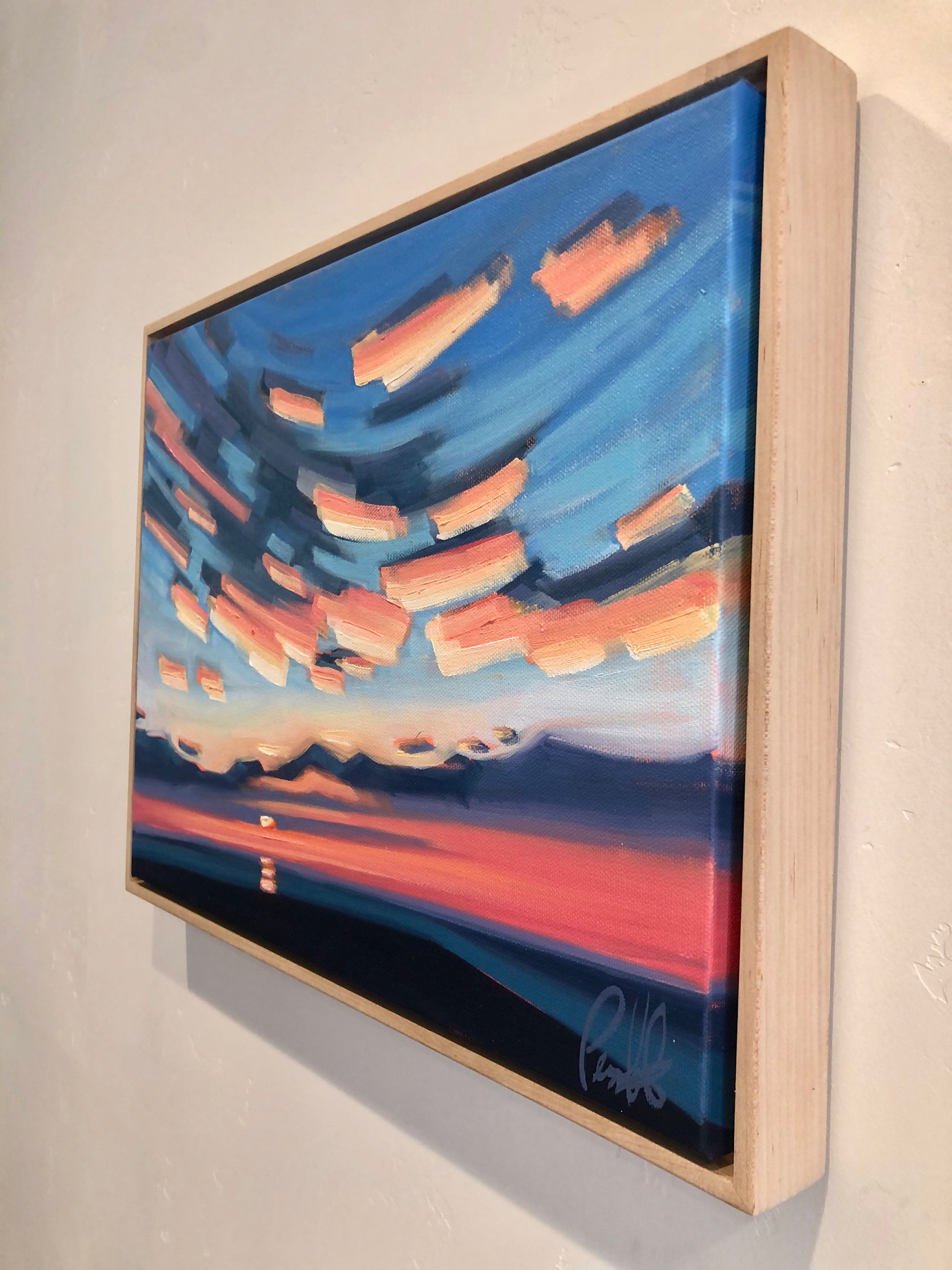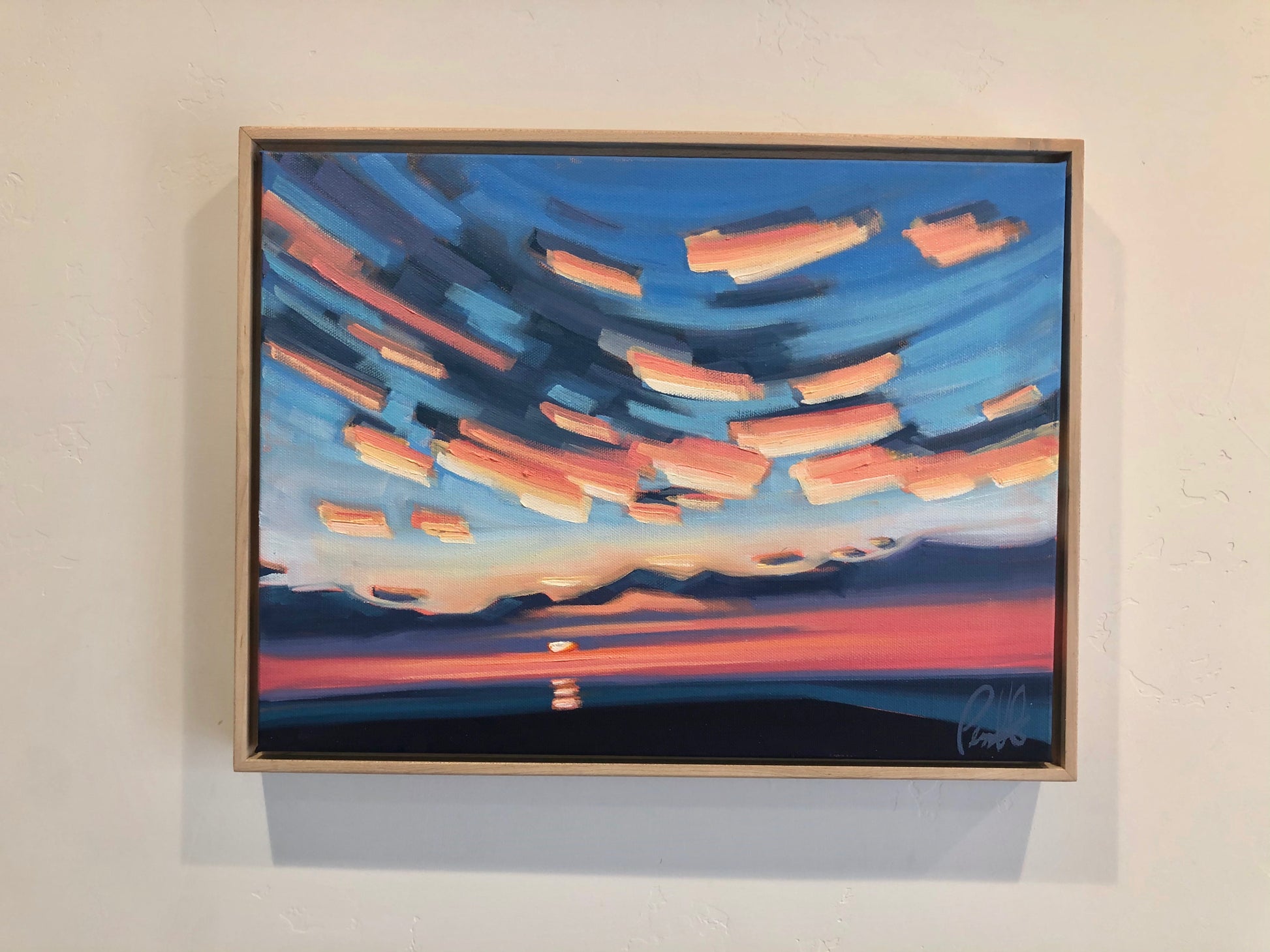 Second, I am constantly investigating new ways to represent clouds in my art. Just as clouds are always shifting and changing in the sky, my stylistic approach to representing and communicating their essence is always evolving and unfolding. Recently, I have been working to break apart their soft billowy, featherlike qualities and instead render their various layers and qualities as rectangular strokes of value and color. I am striving to give the impression of the layers and, perhaps even more importantly, the feeling that the strokes of paint create. By using individual marks, as just the suggestion of clouds, there is a looseness and a freedom that allows us to feel their impermanence.