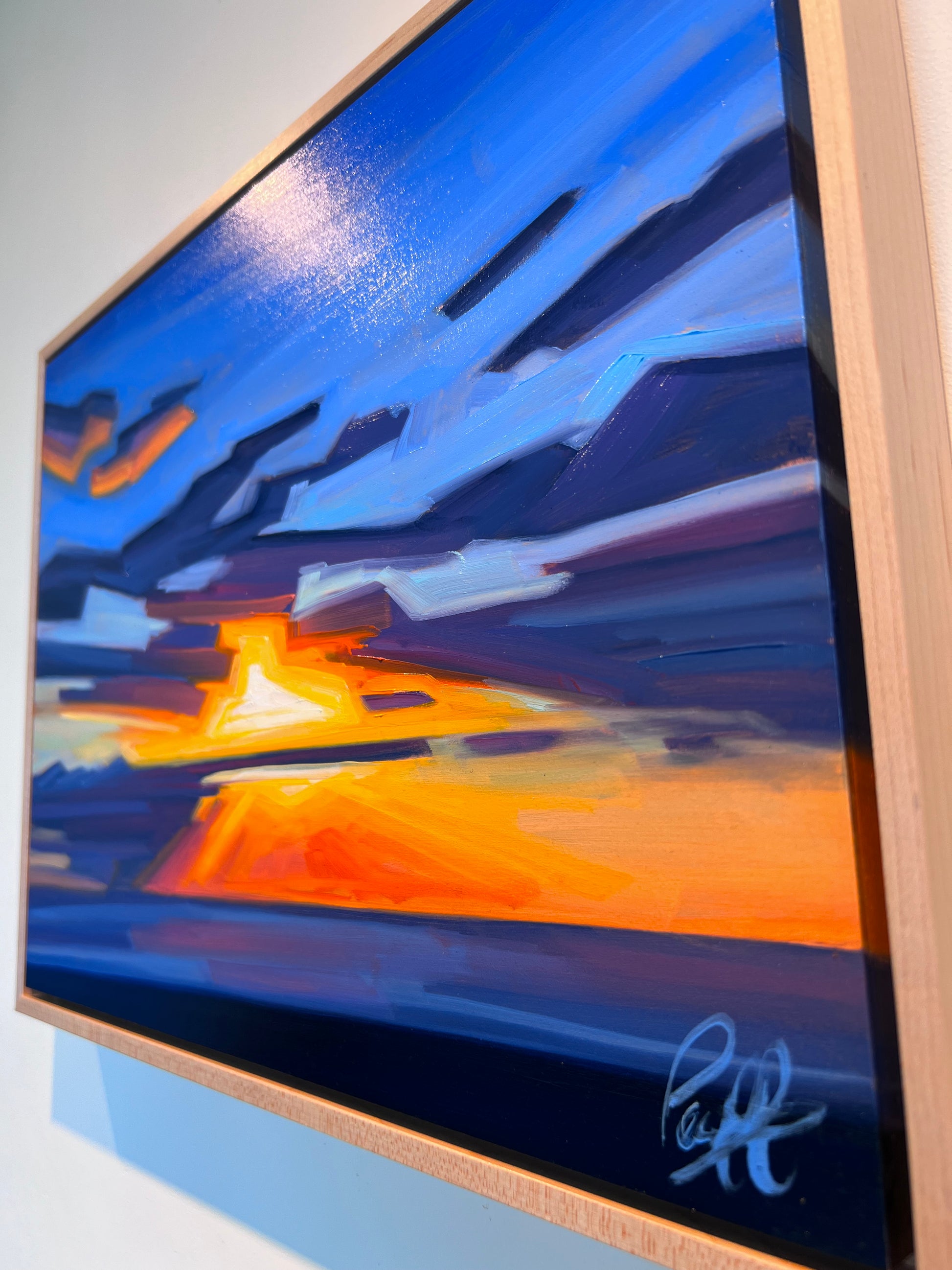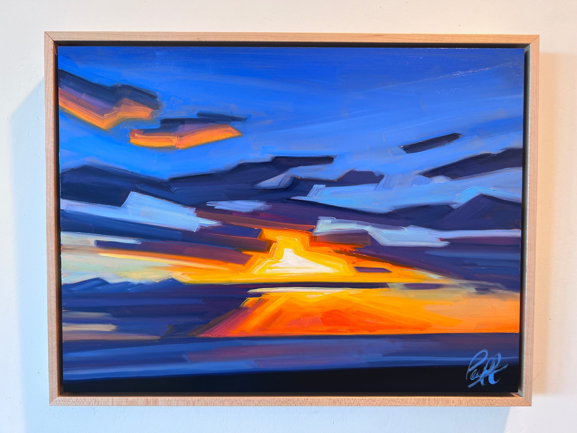 I started this Mini Abstract Sunset series out of the necessity to allow spontaneity to come through the process of painting. Deliberate, simple, vibrant, soothing blocks of moving color penetrate the scene. Working on smaller canvas allows me to be in the moment and to further develop this experimental style, allowing the spontaneous gesture of brushstrokes and how they relate with one another in the composition. Like the fleeting passing of a sunset, the aim is to think less and be in the moment as that moment passes.
