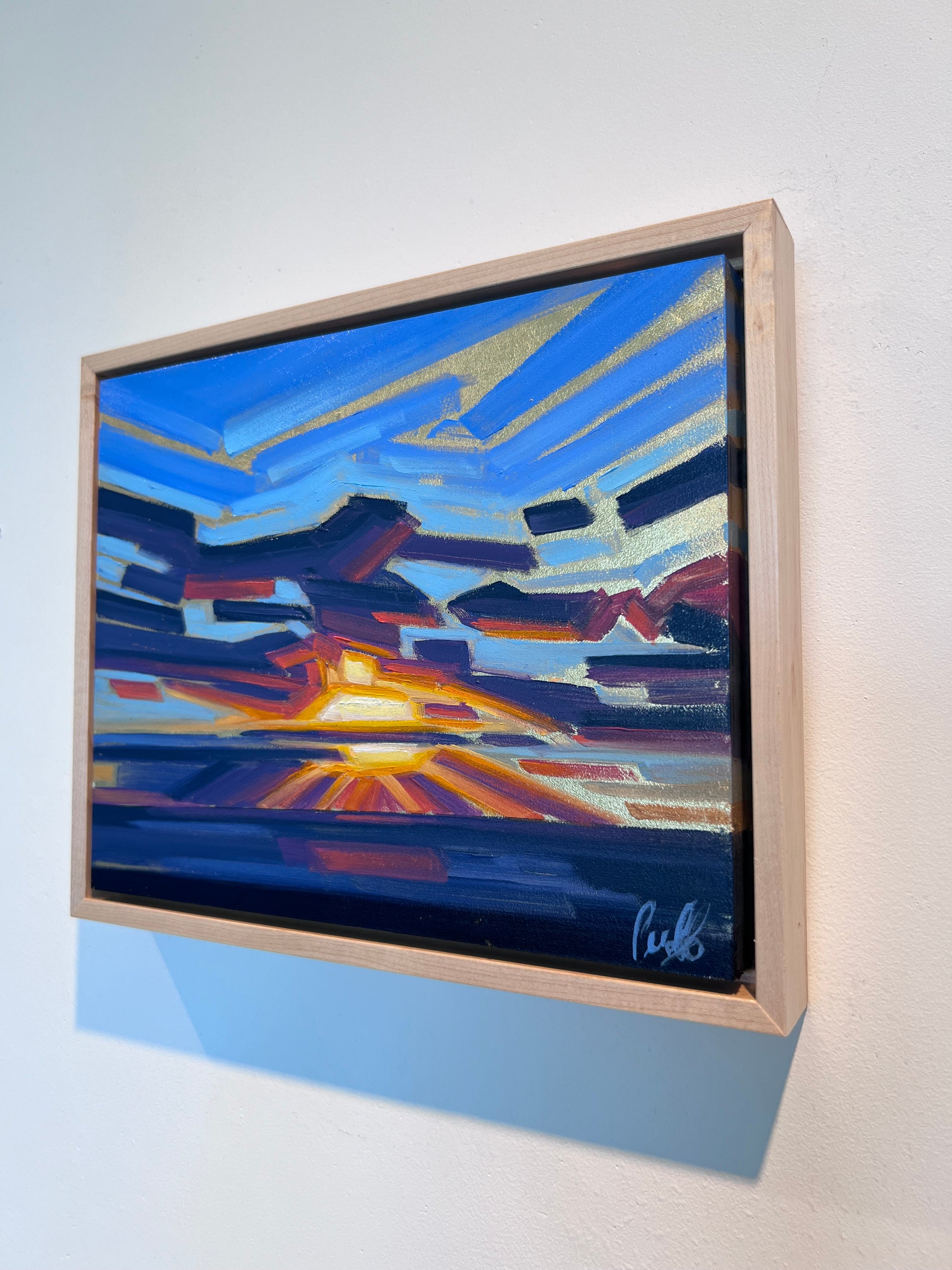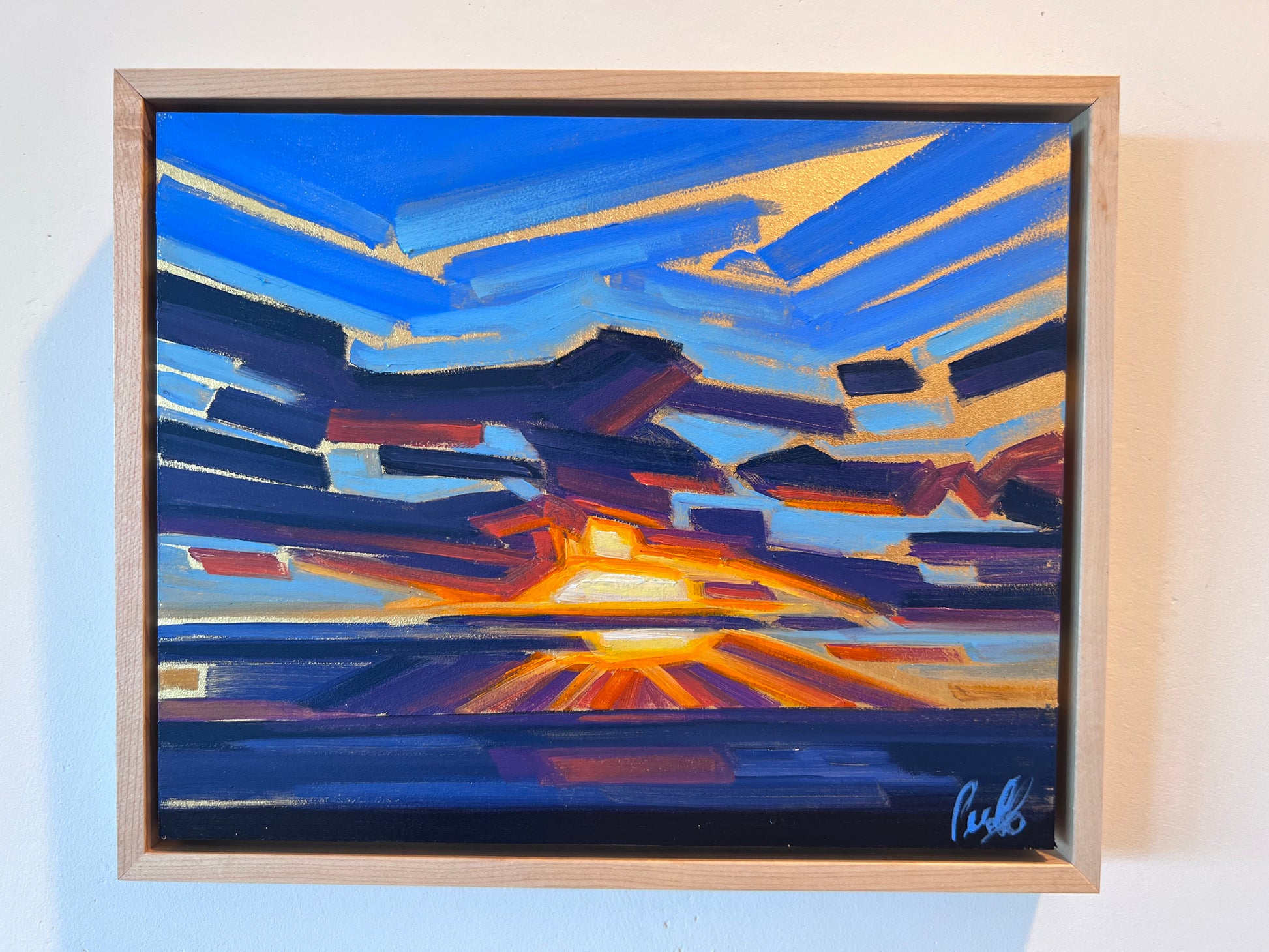 I started this Mini Abstract Sunset series out of the necessity to allow spontaneity to come through the process of painting. Deliberate, simple, vibrant, soothing blocks of moving color penetrate the scene. Working on smaller canvas allows me to be in the moment and to further develop this experimental style, allowing the spontaneous gesture of brushstrokes and how they relate with one another in the composition. Like the fleeting passing of a sunset, the aim is to think less and be in the moment as that moment passes.