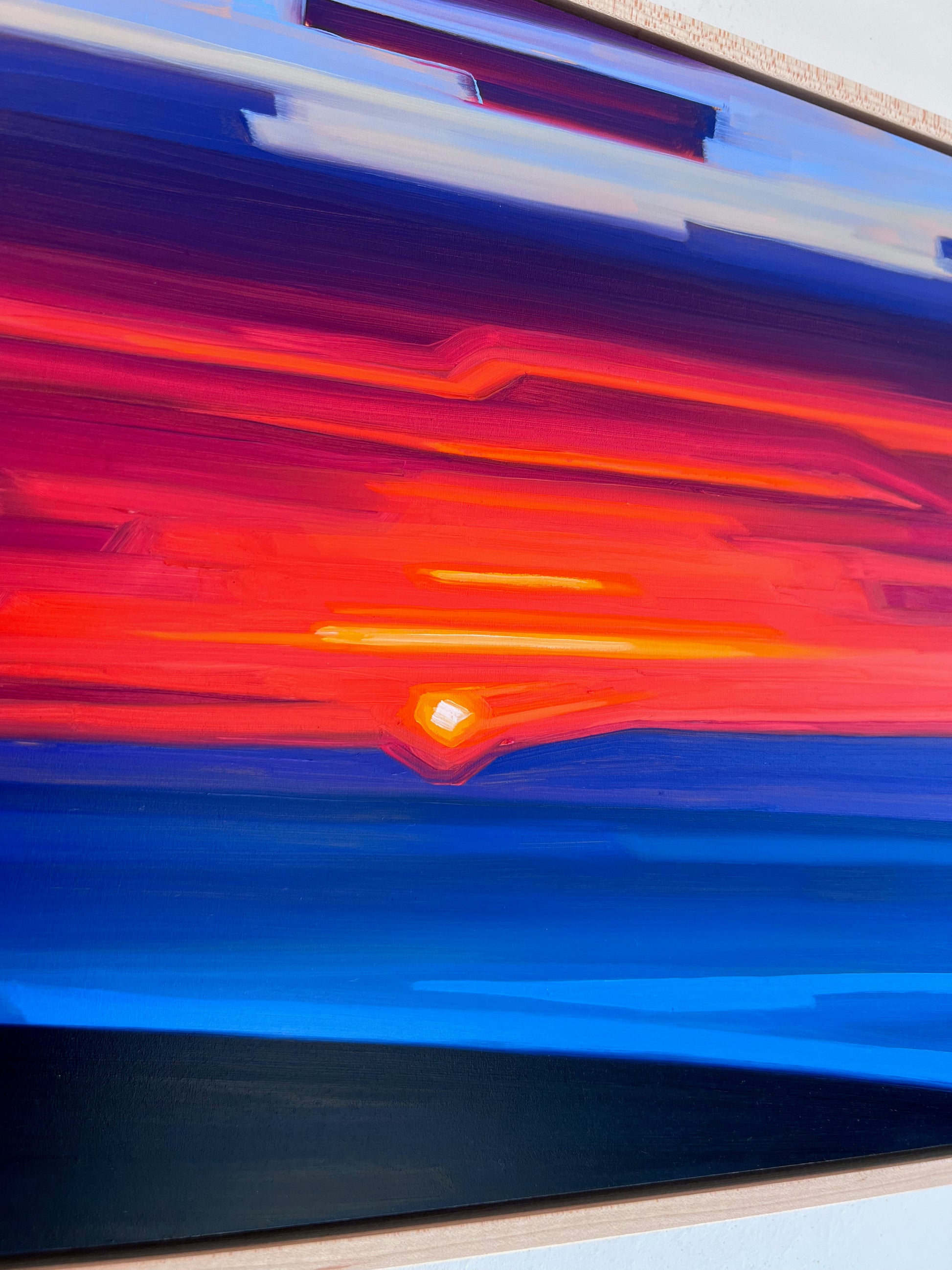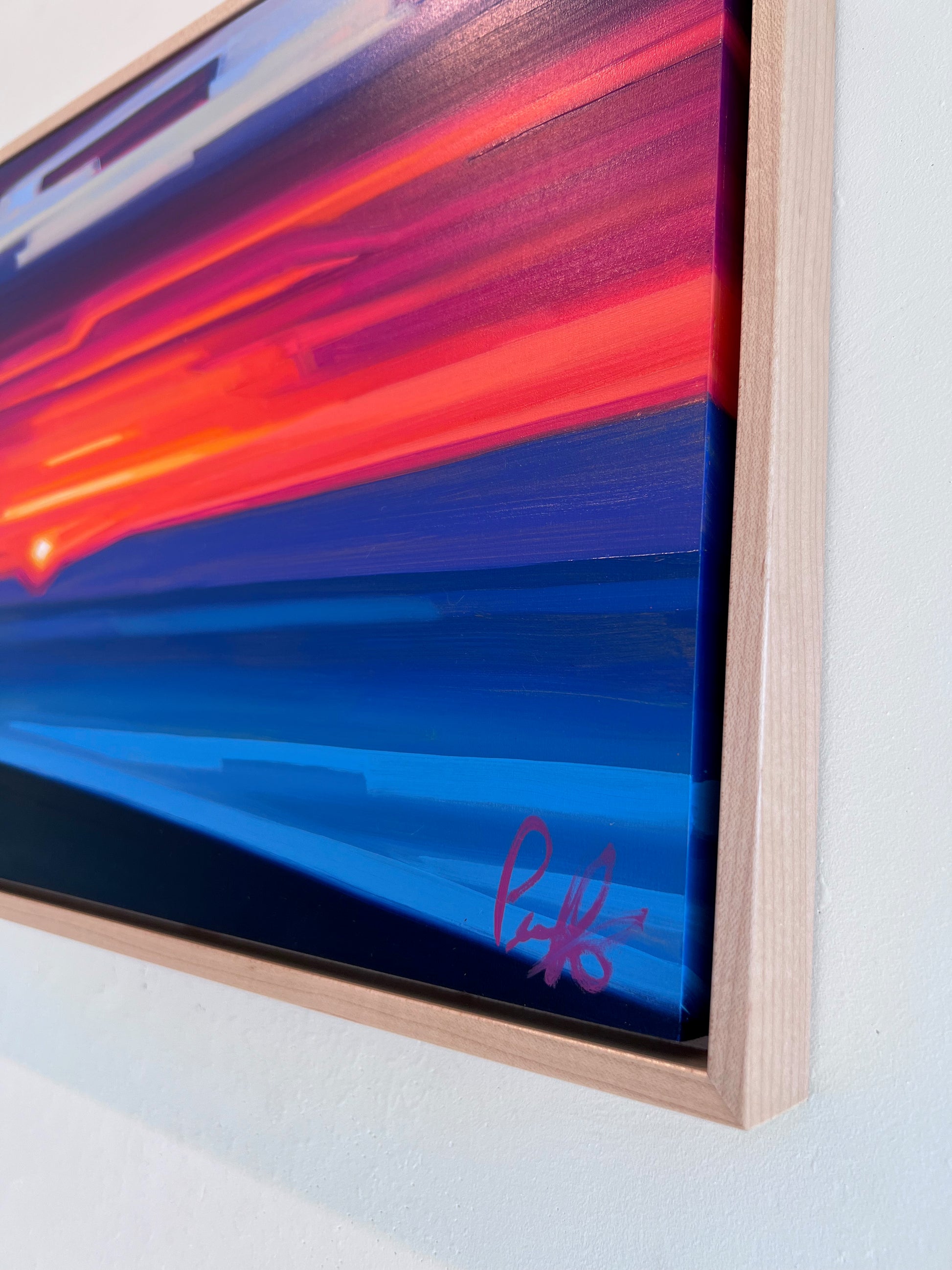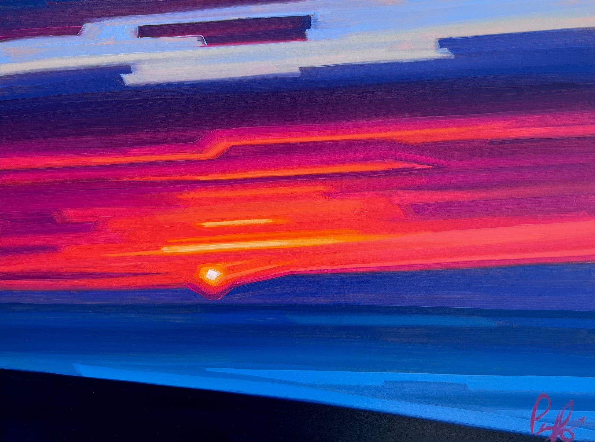 I started this Mini Abstract Sunset series out of the necessity to allow spontaneity to come through the process of painting. Deliberate, simple, vibrant, soothing blocks of moving color penetrate the scene. Working on smaller canvas allows me to be in the moment and to further develop this experimental style, allowing the spontaneous gesture of brushstrokes and how they relate with one another in the composition. Like the fleeting passing of a sunset, the aim is to think less and be in the moment as that moment passes.