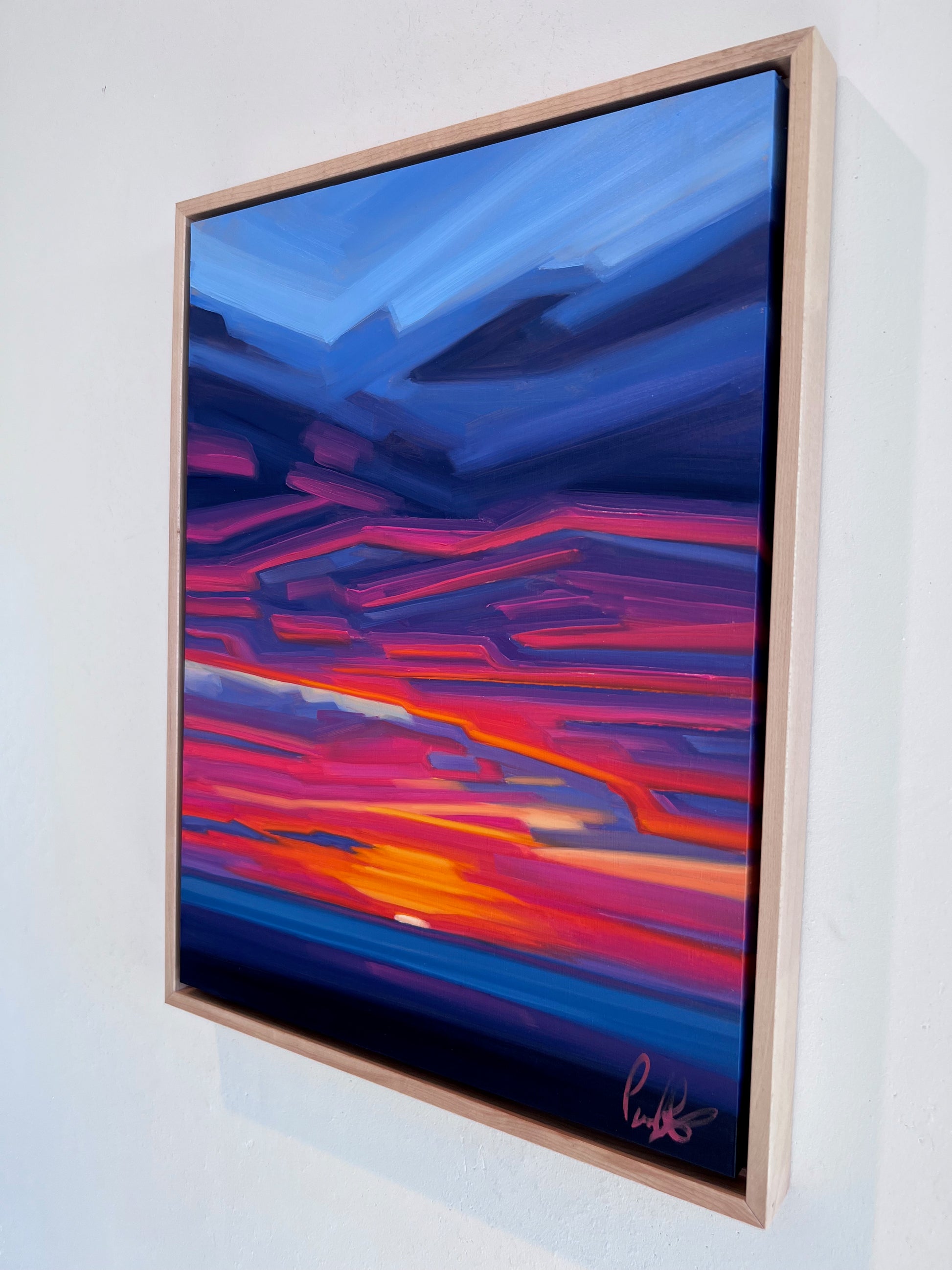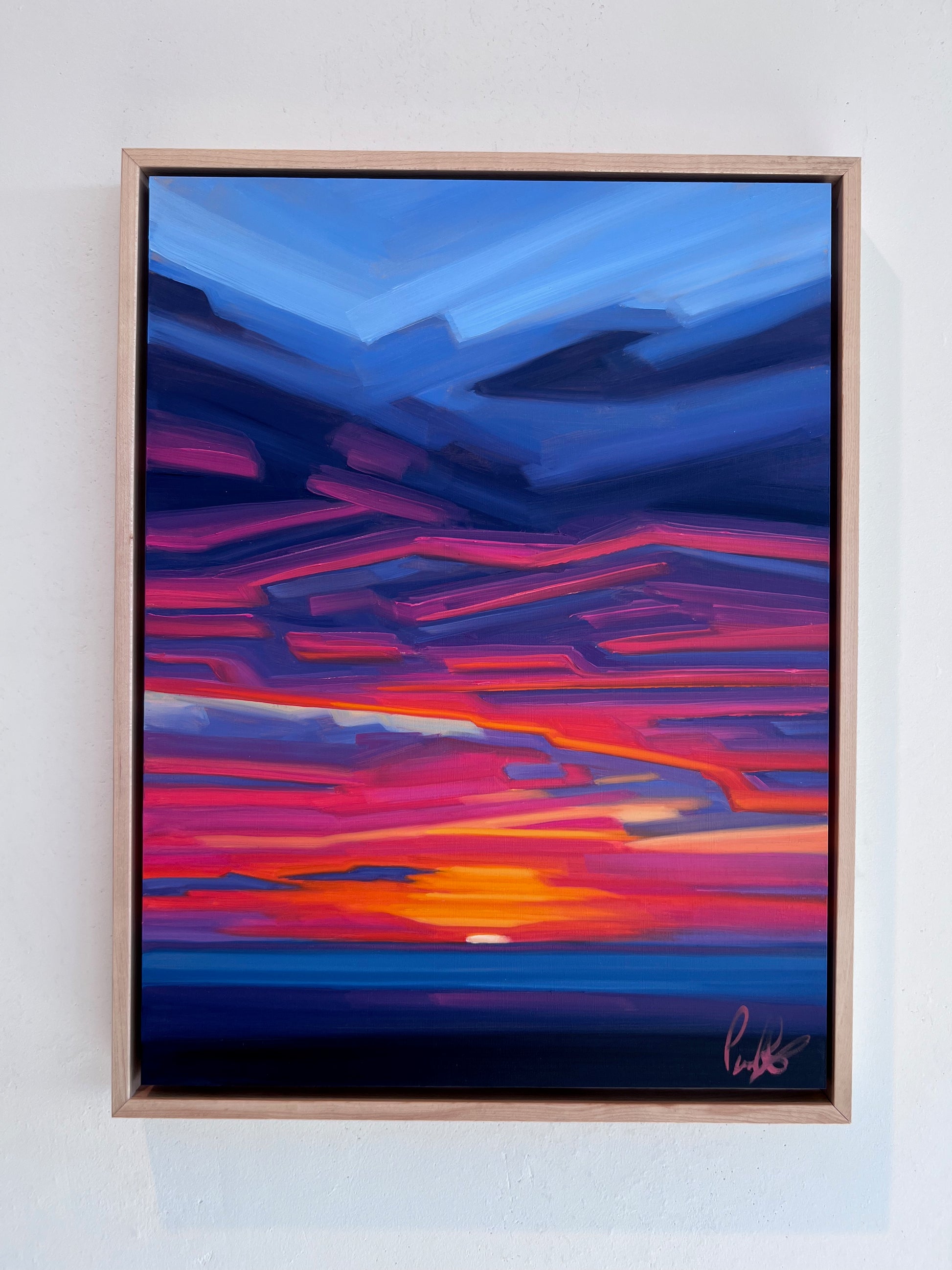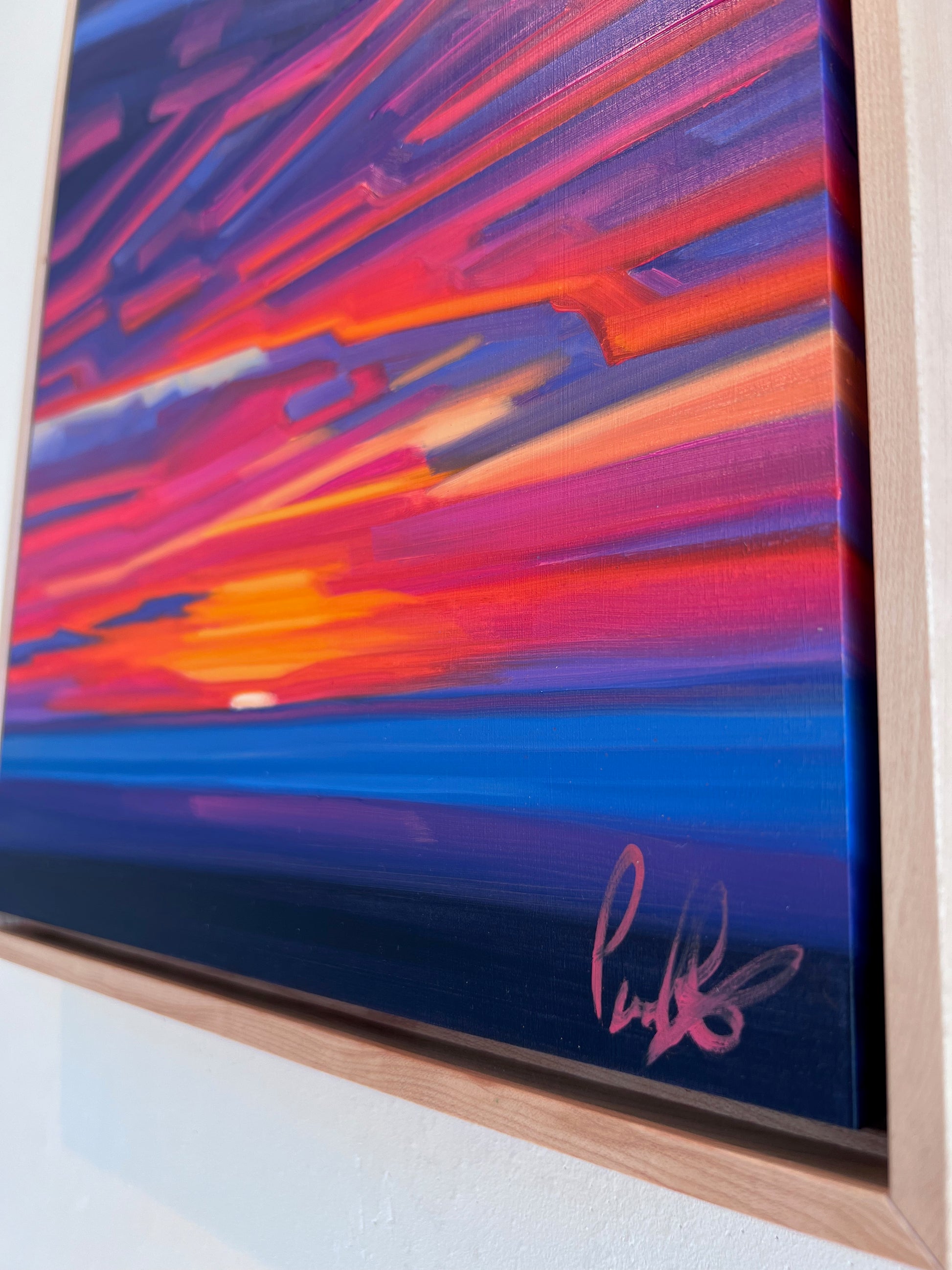 I started this Mini Abstract Sunset series out of the necessity to allow spontaneity to come through the process of painting. Deliberate, simple, vibrant, soothing blocks of moving color penetrate the scene. Working on smaller canvas allows me to be in the moment and to further develop this experimental style, allowing the spontaneous gesture of brushstrokes and how they relate with one another in the composition. Like the fleeting passing of a sunset, the aim is to think less and be in the moment as that moment passes.
