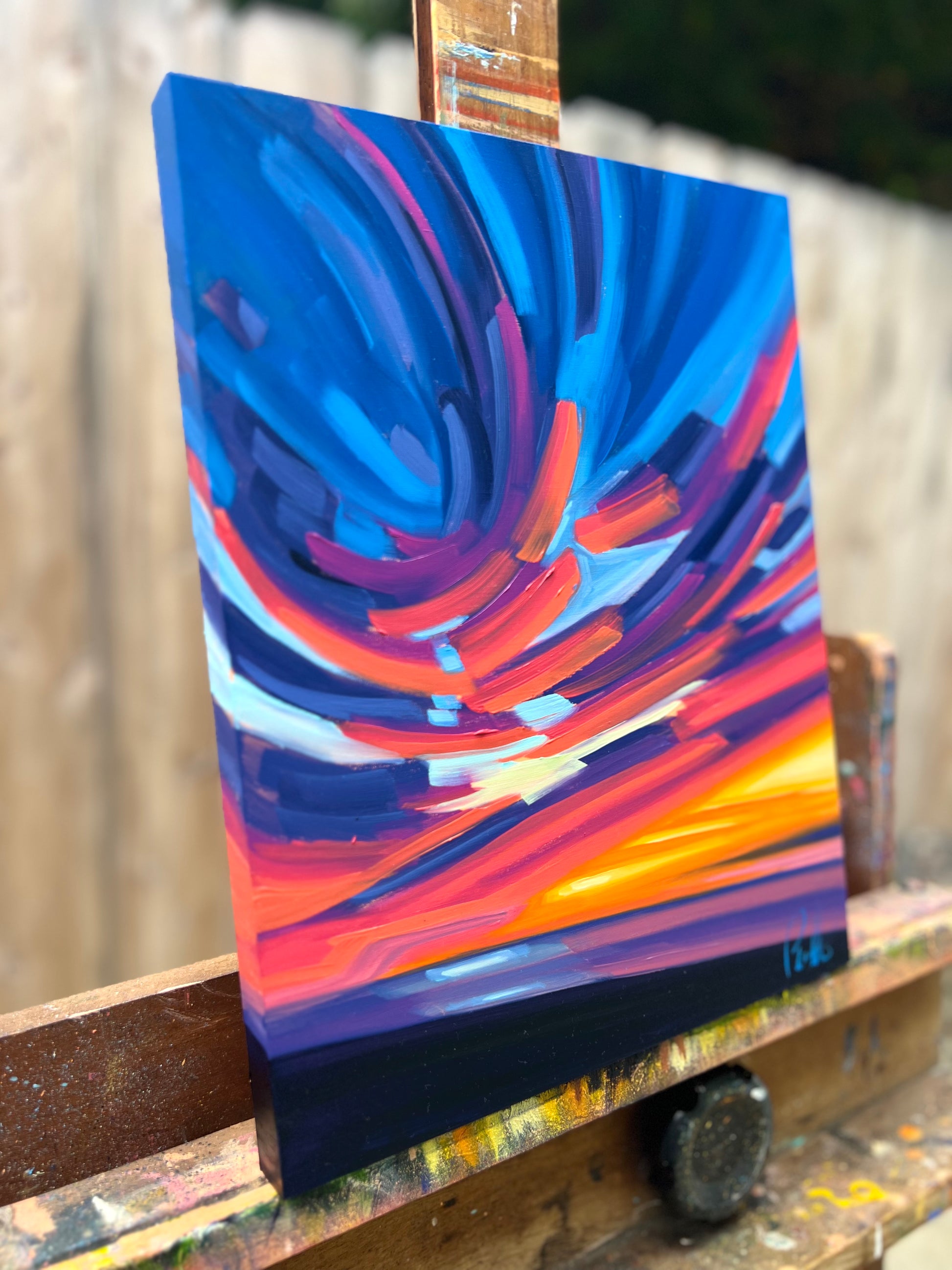 I started this Mini Abstract Sunset series out of the necessity to allow spontaneity to come through the process of painting. Deliberate, simple, vibrant, soothing blocks of moving color penetrate the scene. Working on smaller canvas allows me to be in the moment and to further develop this experimental style, allowing the spontaneous gesture of brushstrokes and how they relate with one another in the composition. Like the fleeting passing of a sunset, the aim is to think less and be in the moment as that moment passes.