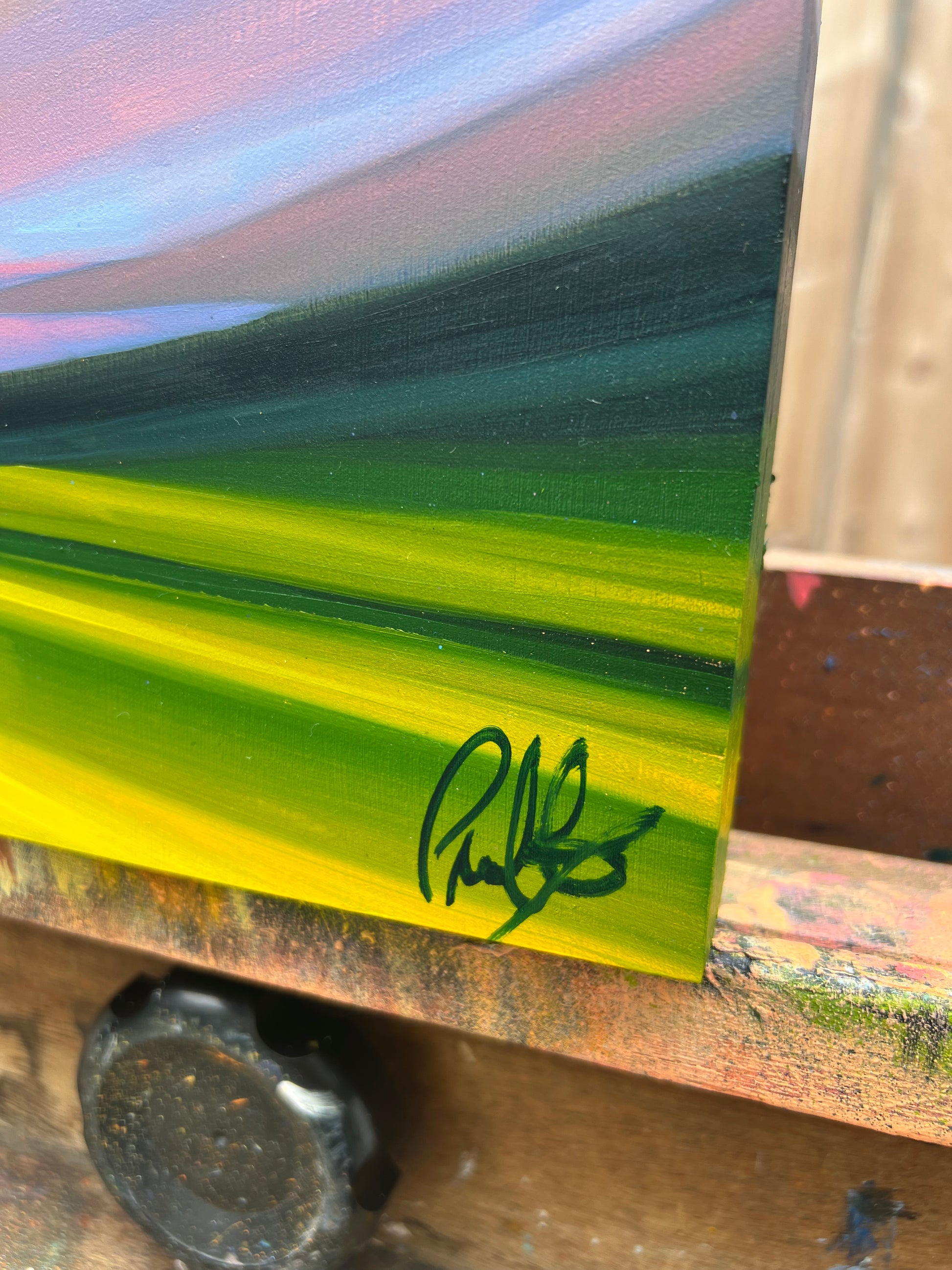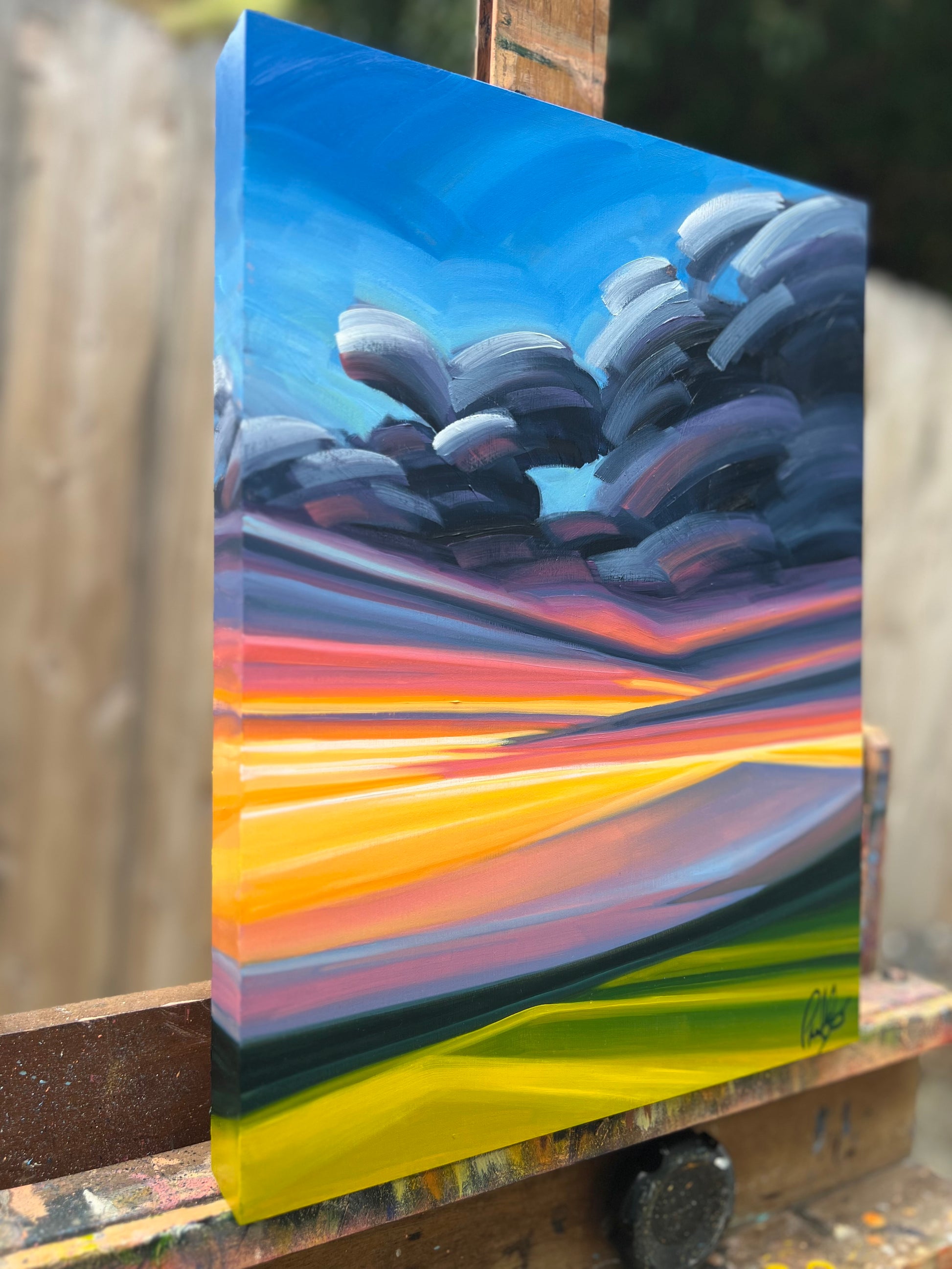 I started this Mini Abstract Sunset series out of the necessity to allow spontaneity to come through the process of painting. Deliberate, simple, vibrant, soothing blocks of moving color penetrate the scene. Working on smaller canvas allows me to be in the moment and to further develop this experimental style, allowing the spontaneous gesture of brushstrokes and how they relate with one another in the composition. Like the fleeting passing of a sunset, the aim is to think less and be in the moment as that moment passes.