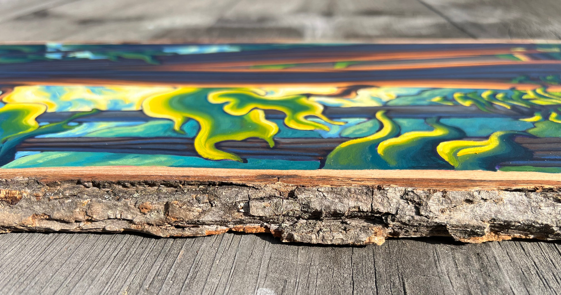 Each of these original oil paintings are painted on Live Bark Basswood. The bark on the edges of the panel, is the actual real bark of the tree. As in nature, each panel's bark is unique, slightly different than the next. Lichens, mosses, and even some dried algae are apparent on this one-of-a-kind Live Bark Panel.