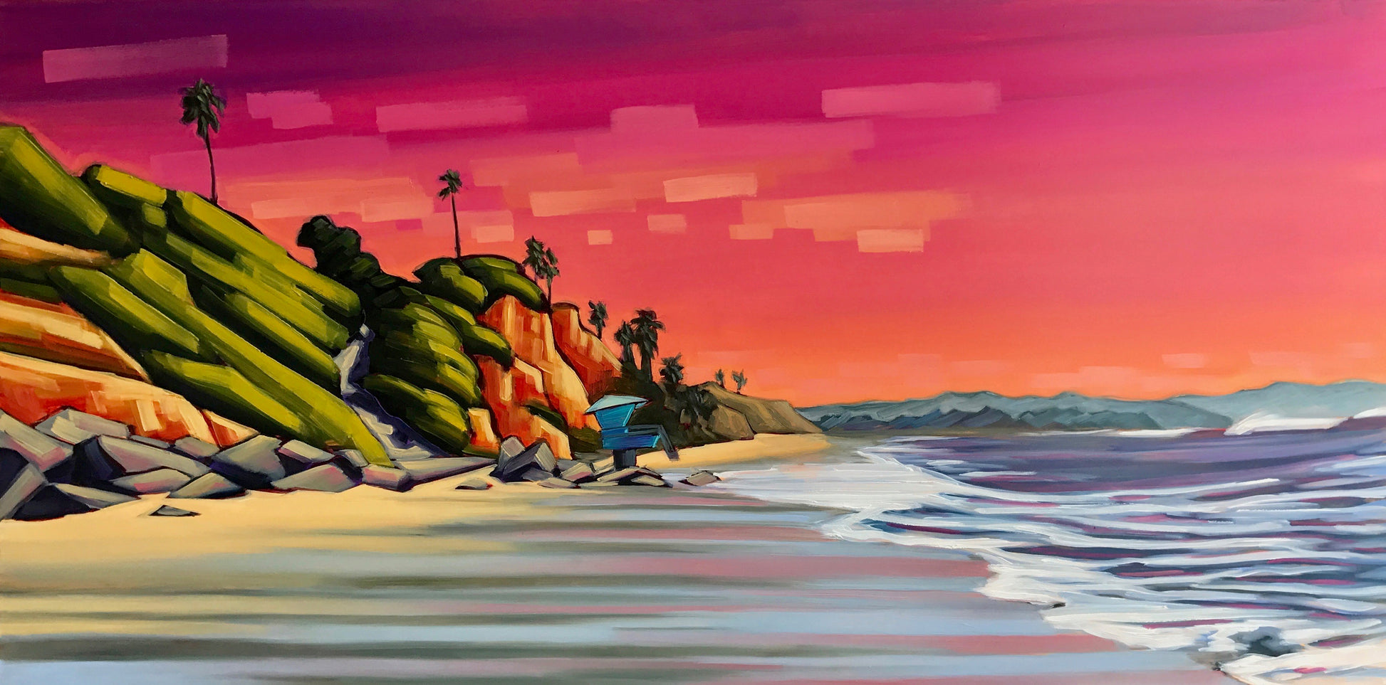 I don't often paint with pinks, but for some reason this series was begging for the pink color palette to be included. It just felt right. I love the energy and harmony that the pinks and purples give this painting, especially against the rich greens. I painted it in my newer style, which is evolving and becoming freer and looser, and focuses on the movement of brush strokes in relation to one another.