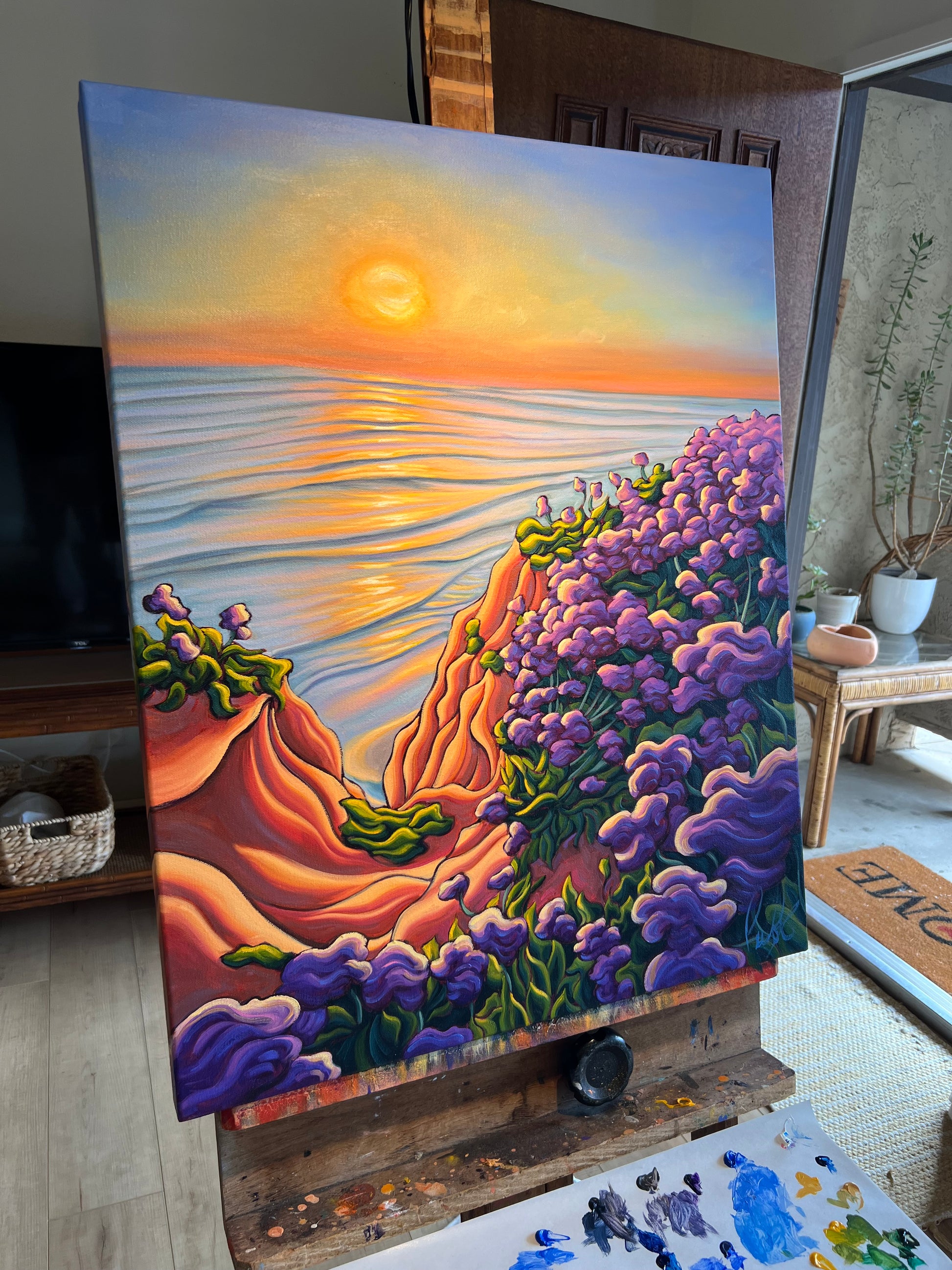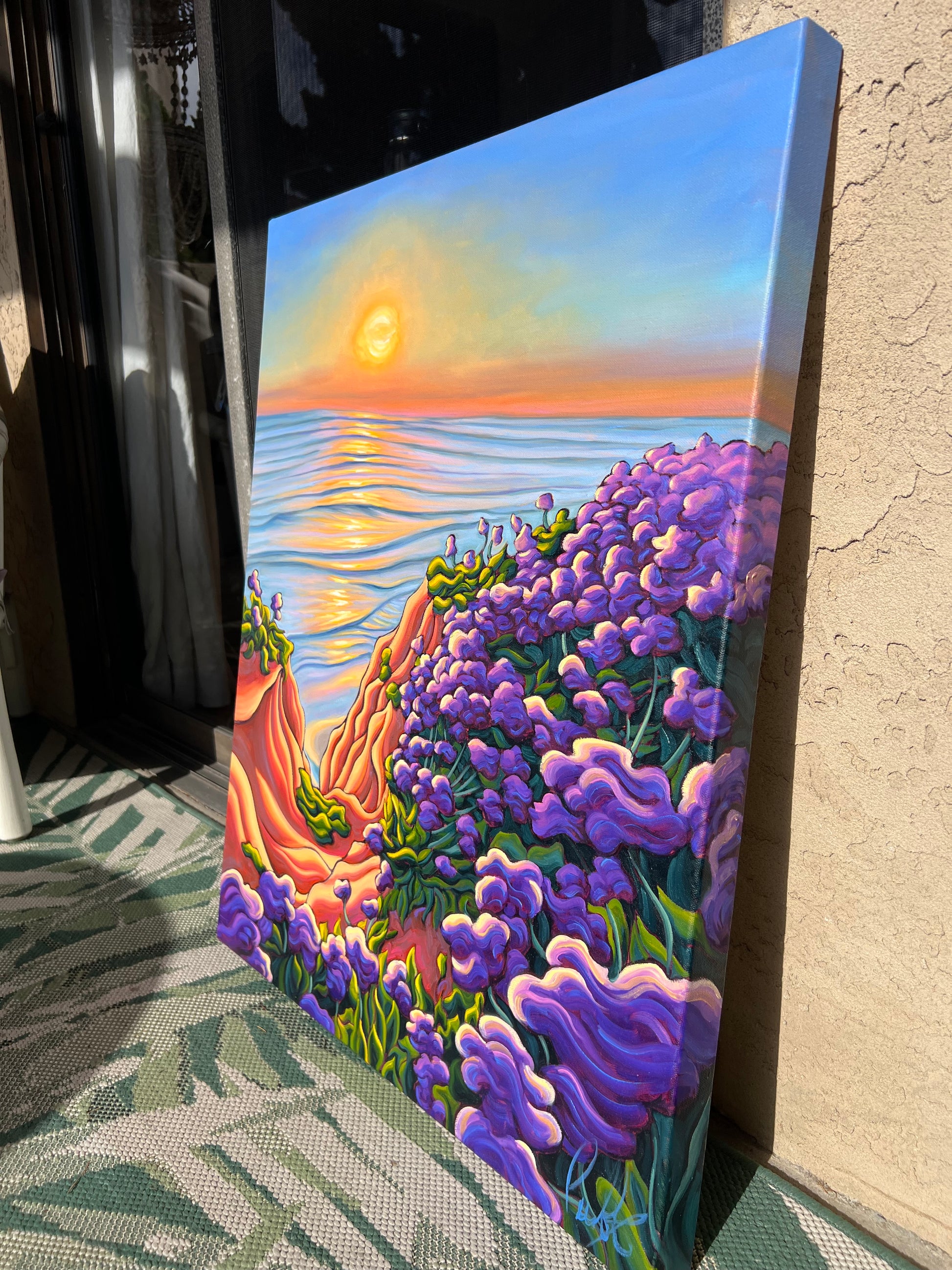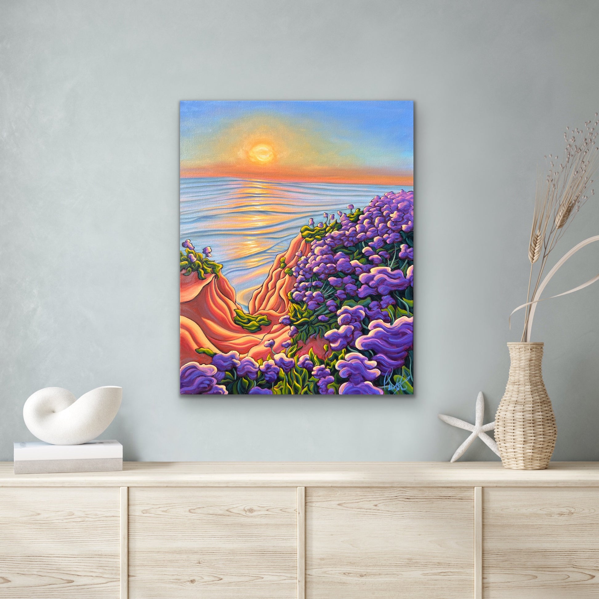 Sunlight pours onto the cliffs and bluffs along the Pacific Ocean, illuminating ribbons of eroded sandstone etched into their weathered faces. The trail tracing the cliff’s edge feels almost magical, especially in summer when it winds through fields of vibrant purple wildflowers, like a scene from a fairytale. Below, the tranquil sea shimmers, reflecting the sun’s golden glow and casting warmth upon the cool blue waters. As sunset approaches and the light begins to soften, the landscape is bathed in a delicate pink hue. Everything feels alive.