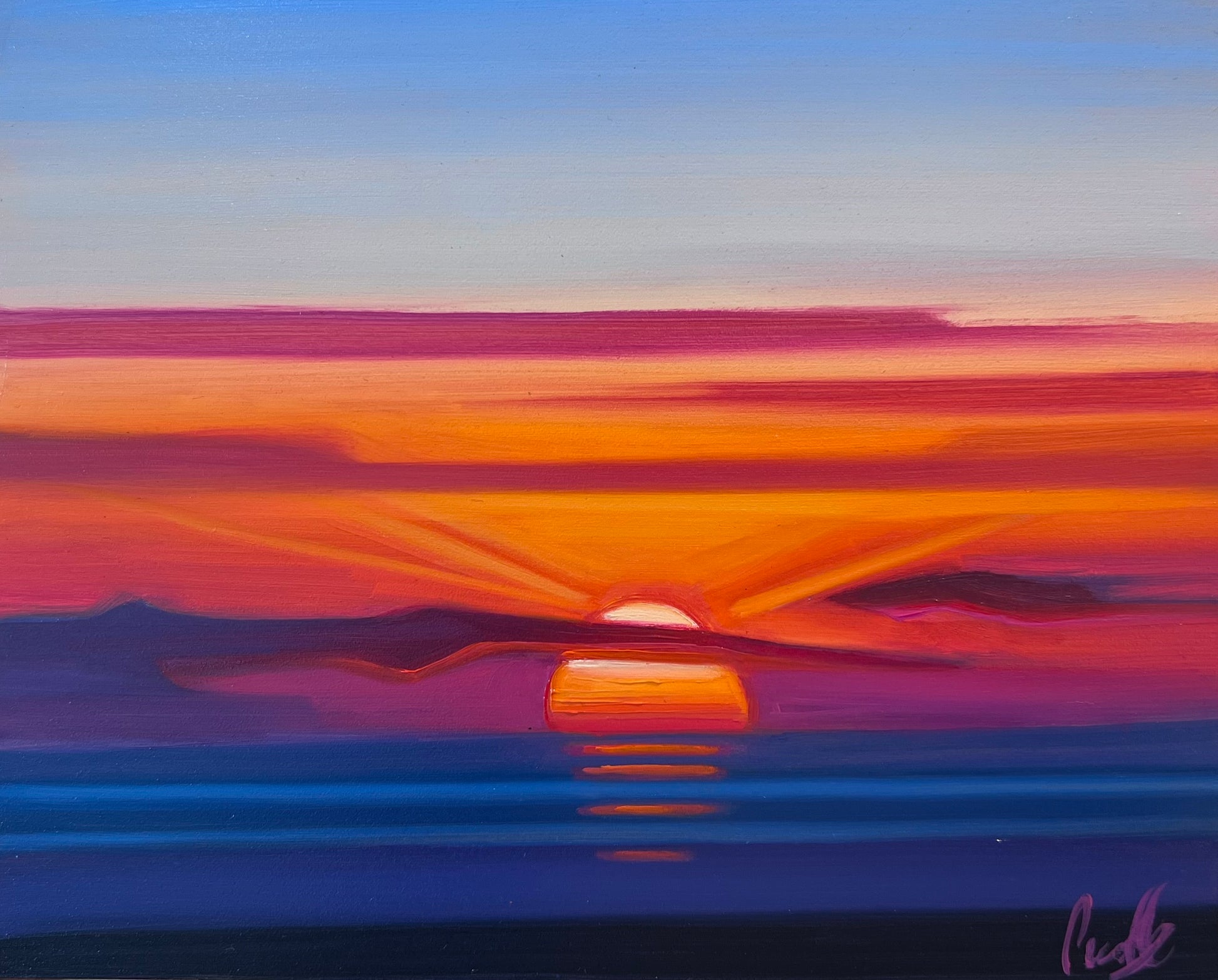 I started this Mini Abstract Sunset series out of the necessity to allow spontaneity to come through the process of painting. Deliberate, simple, vibrant, soothing blocks of moving color penetrate the scene. Working on smaller canvas allows me to be in the moment and to further develop this experimental style, allowing the spontaneous gesture of brushstrokes and how they relate with one another in the composition. Like the fleeting passing of a sunset, the aim is to think less and be in the moment as that moment passes.