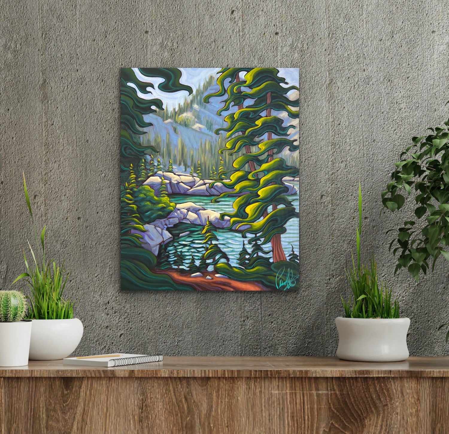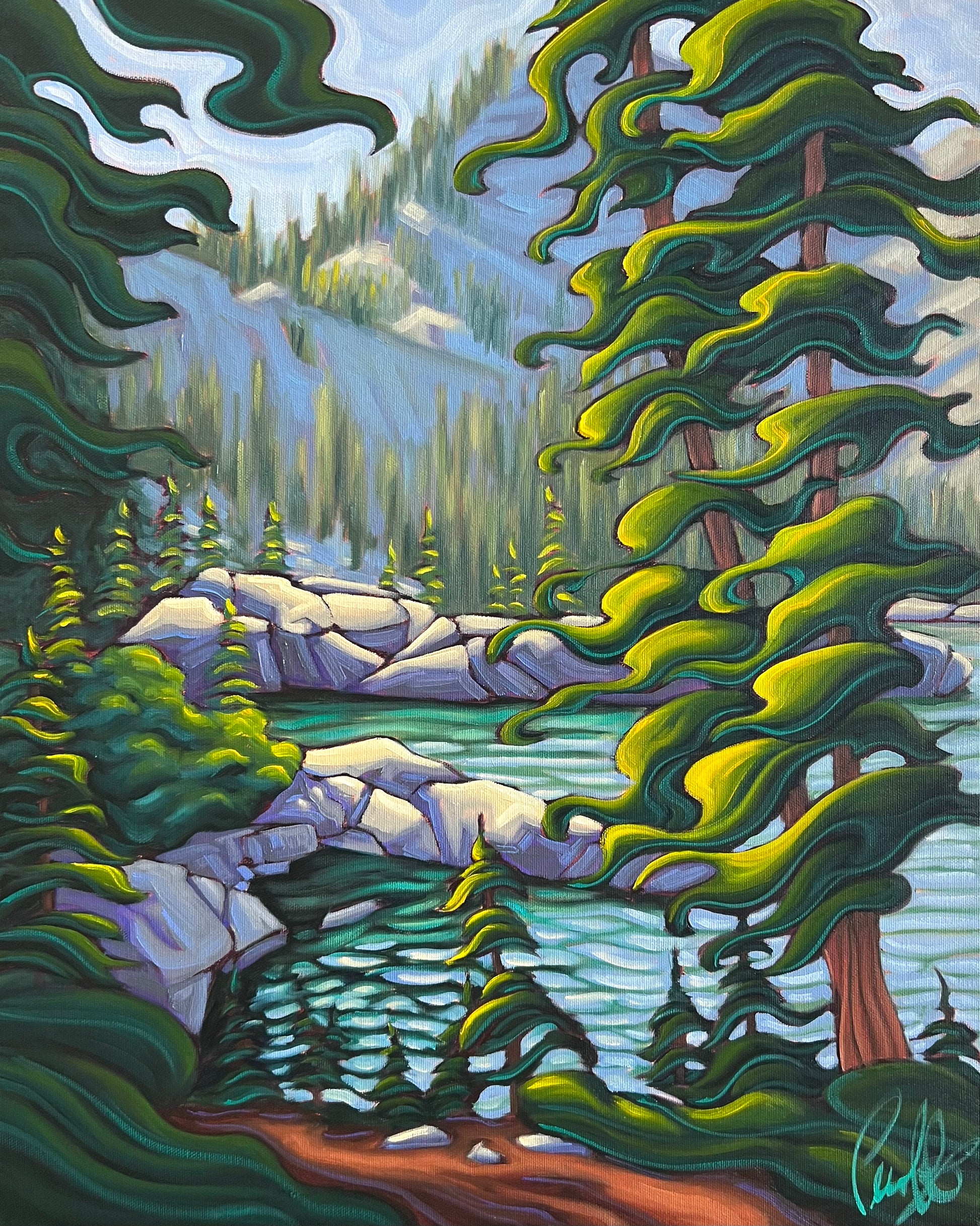 Inspired by a trail hike to a series of hidden lakes in the alpine wilderness. After some time of steadily climbing up the path, the cool turquoise waters of the lake began to appear through the trees, a peek of blue amongst all the green. The trail ran alongside the lake, weaving in and out the forest trees. The smooth granite rock formations stretched like fingers into the water. Nothing better than swimming in a cool tranquil lake after a long uphill sweaty hike!