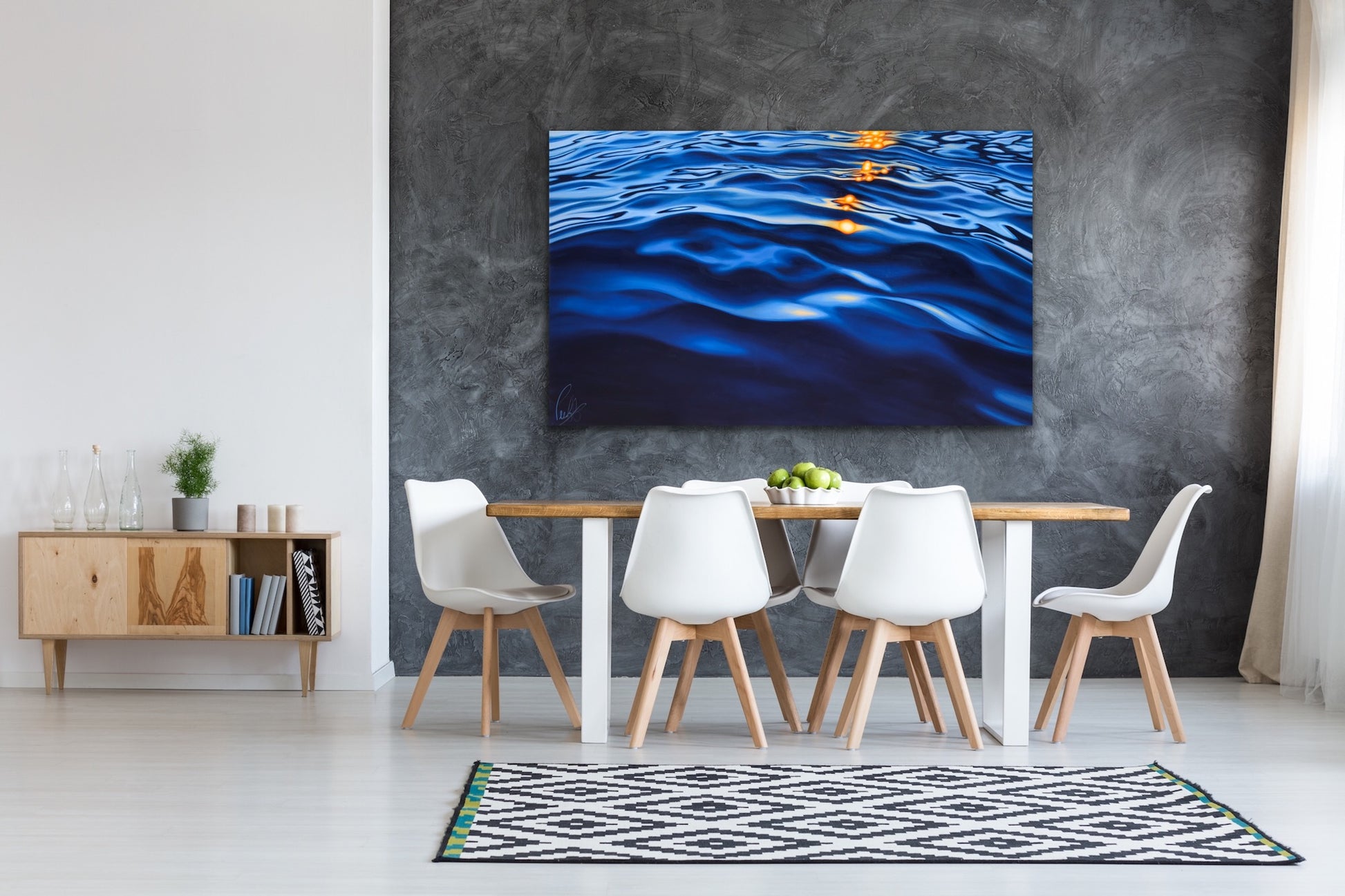 Inspired by my time sailing the beautiful blue waters of Sardinia off the coast of Italy.  I was mesmerized by the deep dark blue of the water at sunset, and the sparkles of gold that illuminated the high points of the waves.