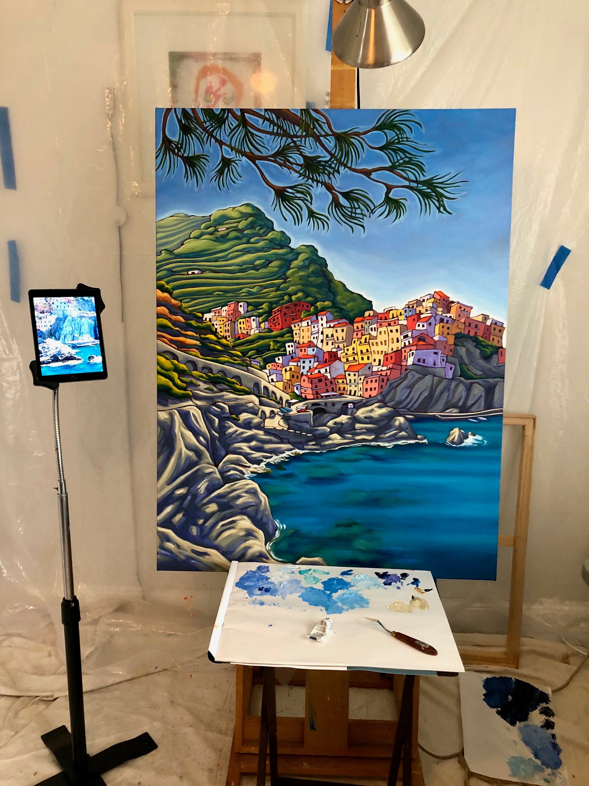 The five charming towns of Cinque Terra sit nestled within the craggy coastline. There are many ways to explore this area, you can hike winding cliffside trails through olive trees and vineyards, giving the opportunity to take in the sweeping views. You can take a boat and marvel at the colorful buildings, while surrounded by turquoise colored water, or take a train to any of the towns to stop and get a closer look. This day I strapped on my backpack full of paints, grabbed my easel, and hopped on a train from where I was based 45 min away, to the beautiful town of Manarola. I made my way through the crowds of tourists admiring the town, and explored the nearby hillsides hoping to find the perfect isolated spot to paint for the day. I finally settled on this beautiful little area adjacent to a vineyard. There I was, in Cinque Terra, the light was clear and vibrant, grapes all around, and a whole afternoon in front of me to capture it in paint.