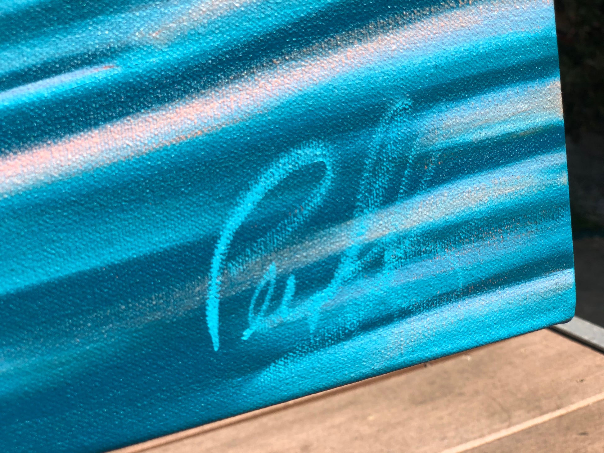 This original measures 72" x 30" x 1.5," and is gallery wrapped (painting continues around the sides). In person, the painting is vibrant and filled with color, however the color in the image above is a little saturated and dark in the upper left sky (more accurate in person).