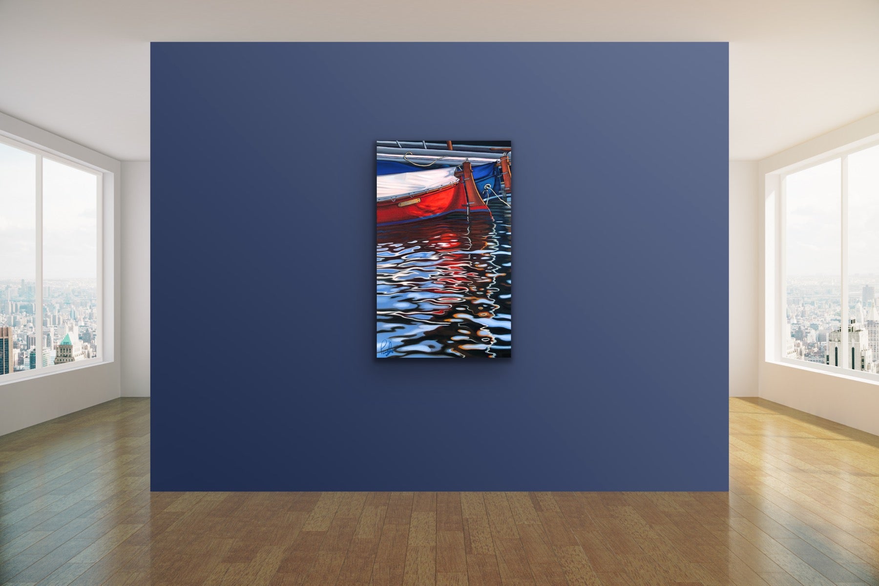Inspired by colorful reflections of boats in the picturesque harbor of beautiful Portofino, Italy. I remember walking along the harbour, mesmerized by how the reflections merged and morphed into one another. It looked as if someone spilled paint in the water. The name on the boat is Cigno, which translates to Swan, and which I think is fitting for this gently floating scene of boats on the water.