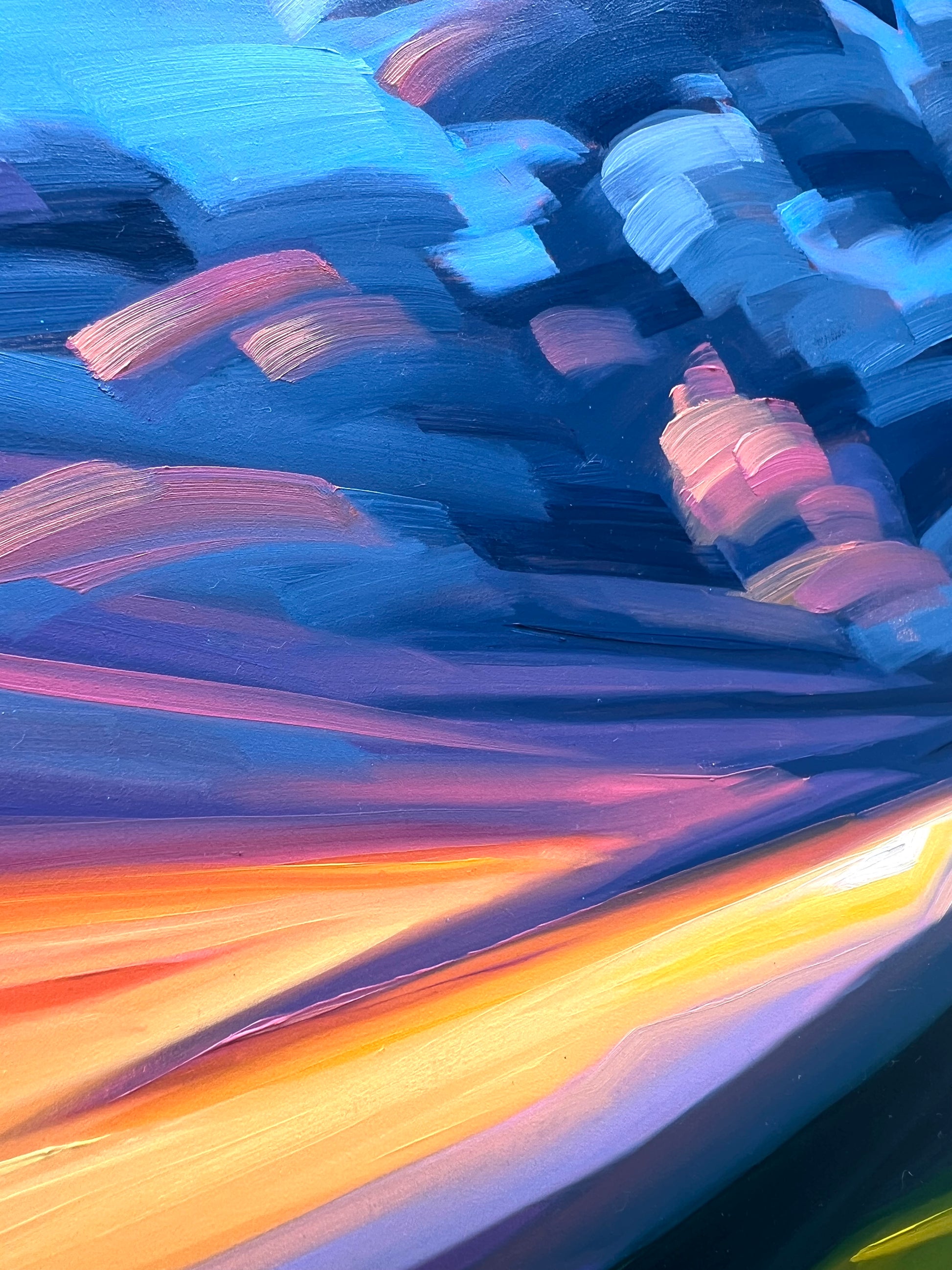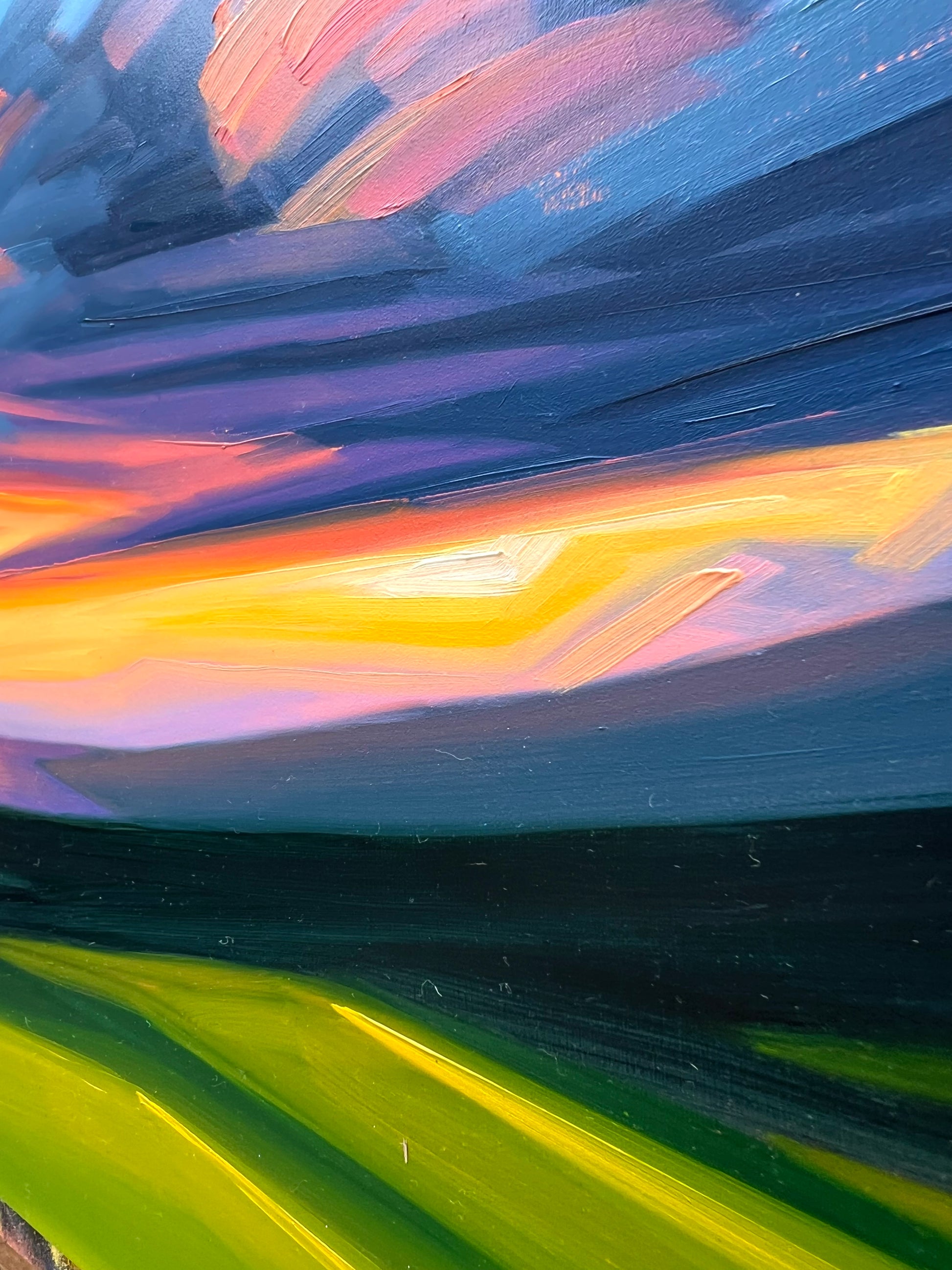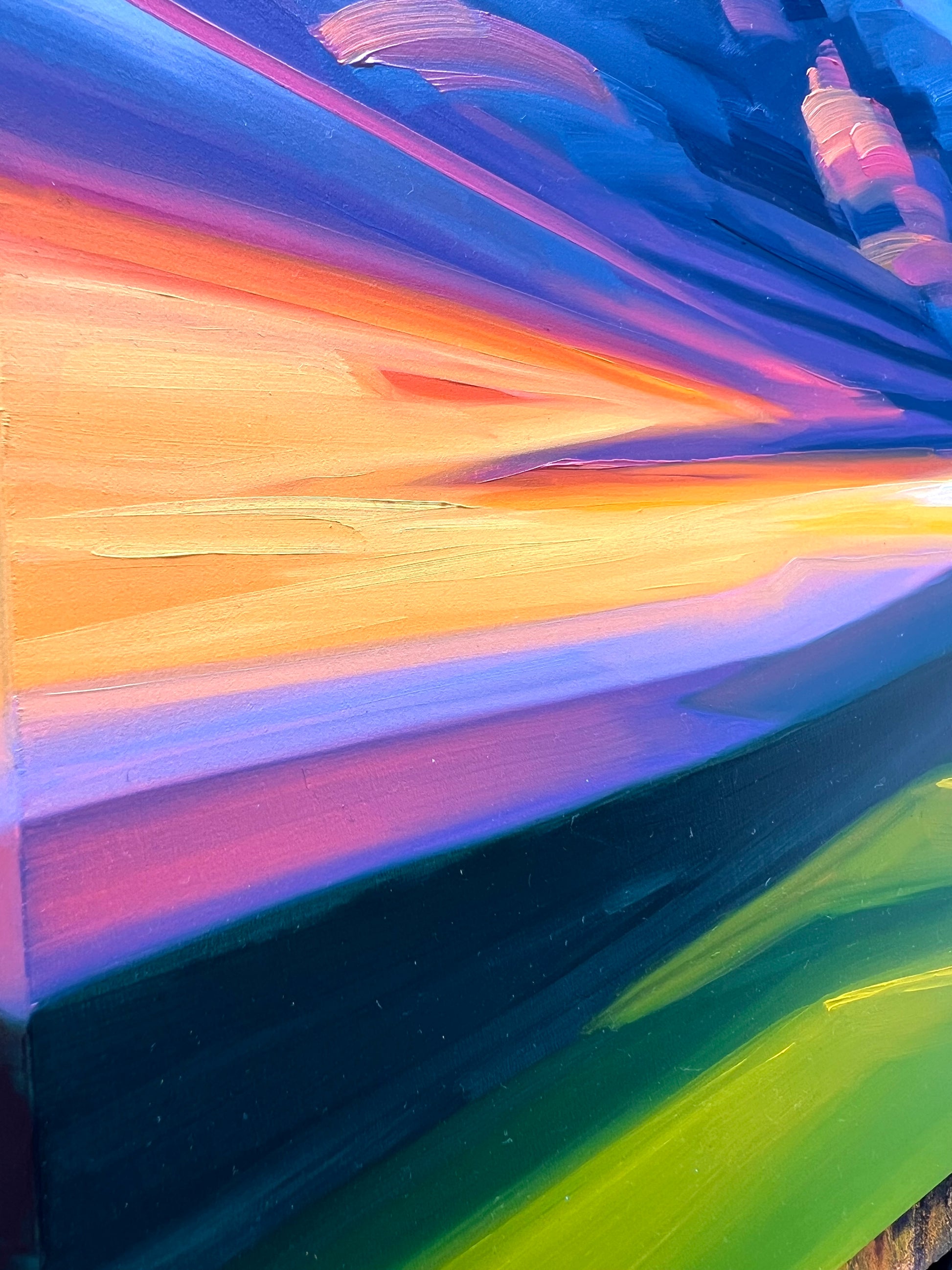 I started this Mini Abstract Sunset series out of the necessity to allow spontaneity to come through the process of painting. Deliberate, simple, vibrant, soothing blocks of moving color penetrate the scene. Working on smaller canvas allows me to be in the moment and to further develop this experimental style, allowing the spontaneous gesture of brushstrokes and how they relate with one another in the composition. Like the fleeting passing of a sunset, the aim is to think less and be in the moment as that moment passes.