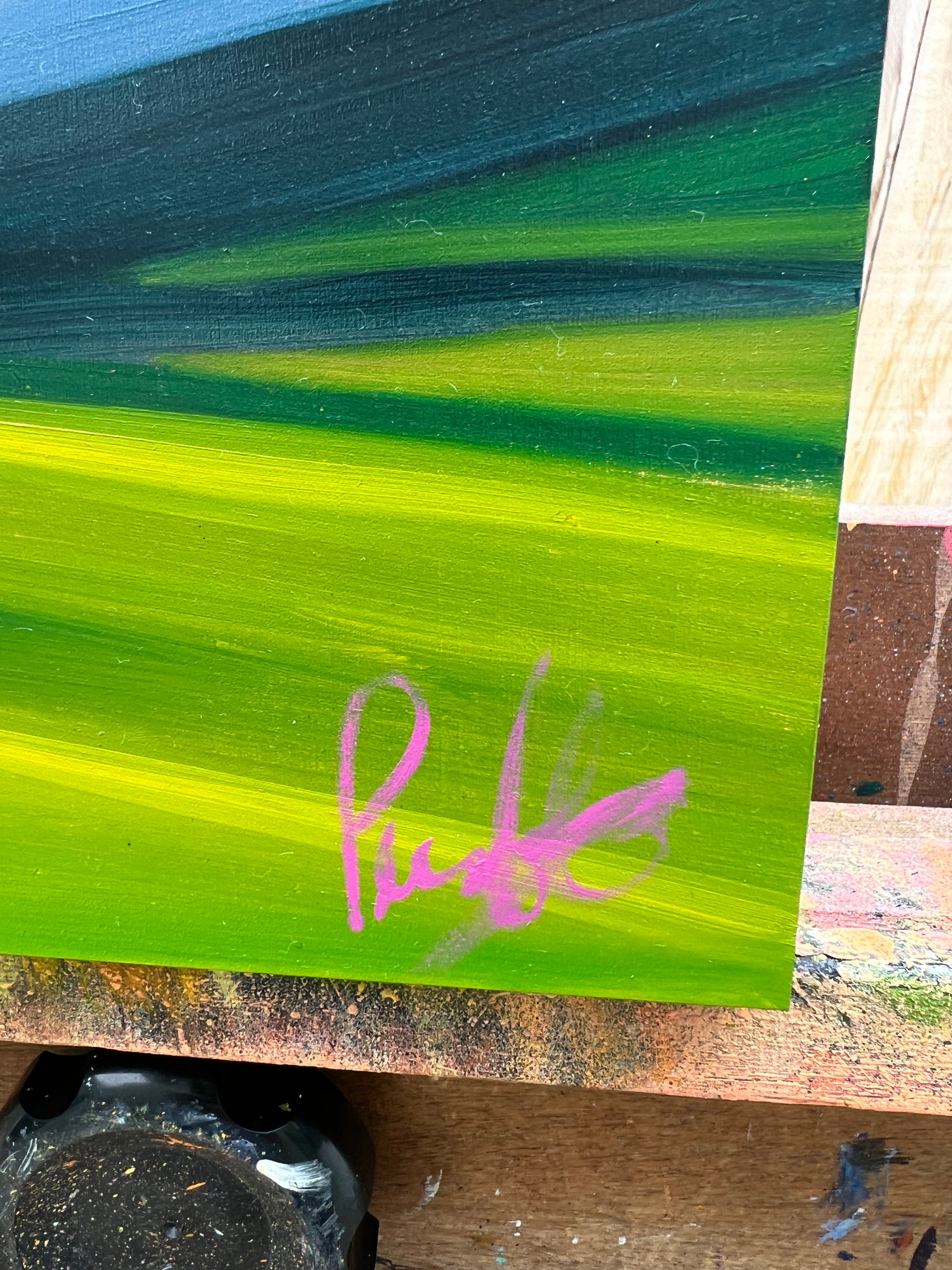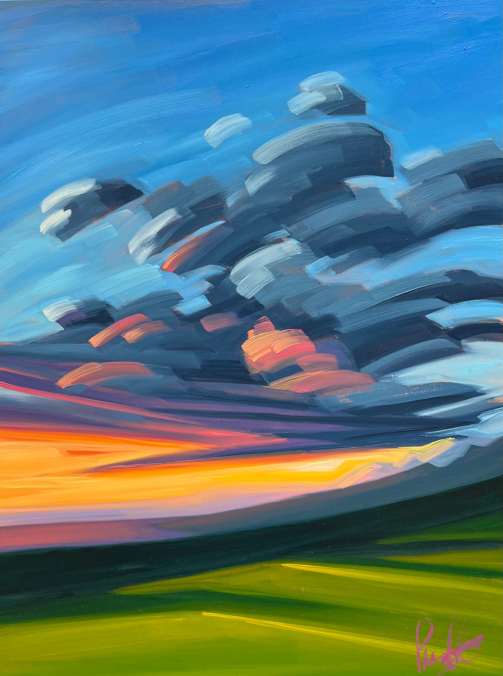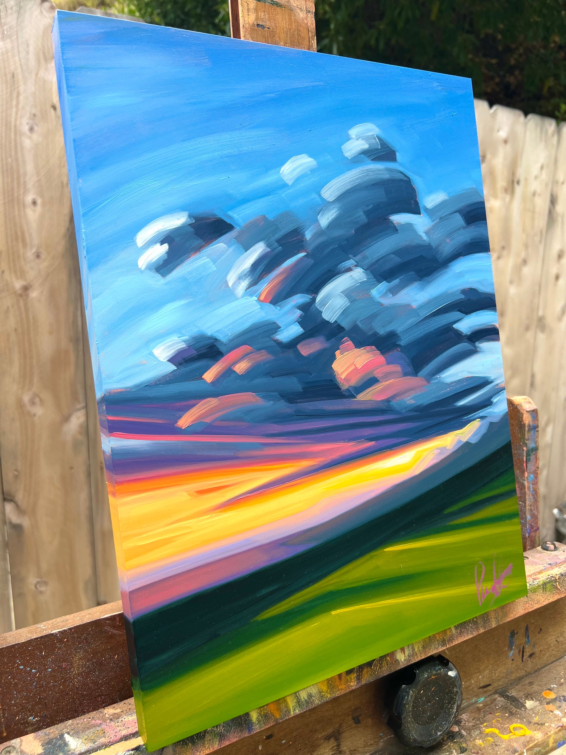 I started this Mini Abstract Sunset series out of the necessity to allow spontaneity to come through the process of painting. Deliberate, simple, vibrant, soothing blocks of moving color penetrate the scene. Working on smaller canvas allows me to be in the moment and to further develop this experimental style, allowing the spontaneous gesture of brushstrokes and how they relate with one another in the composition. Like the fleeting passing of a sunset, the aim is to think less and be in the moment as that moment passes.